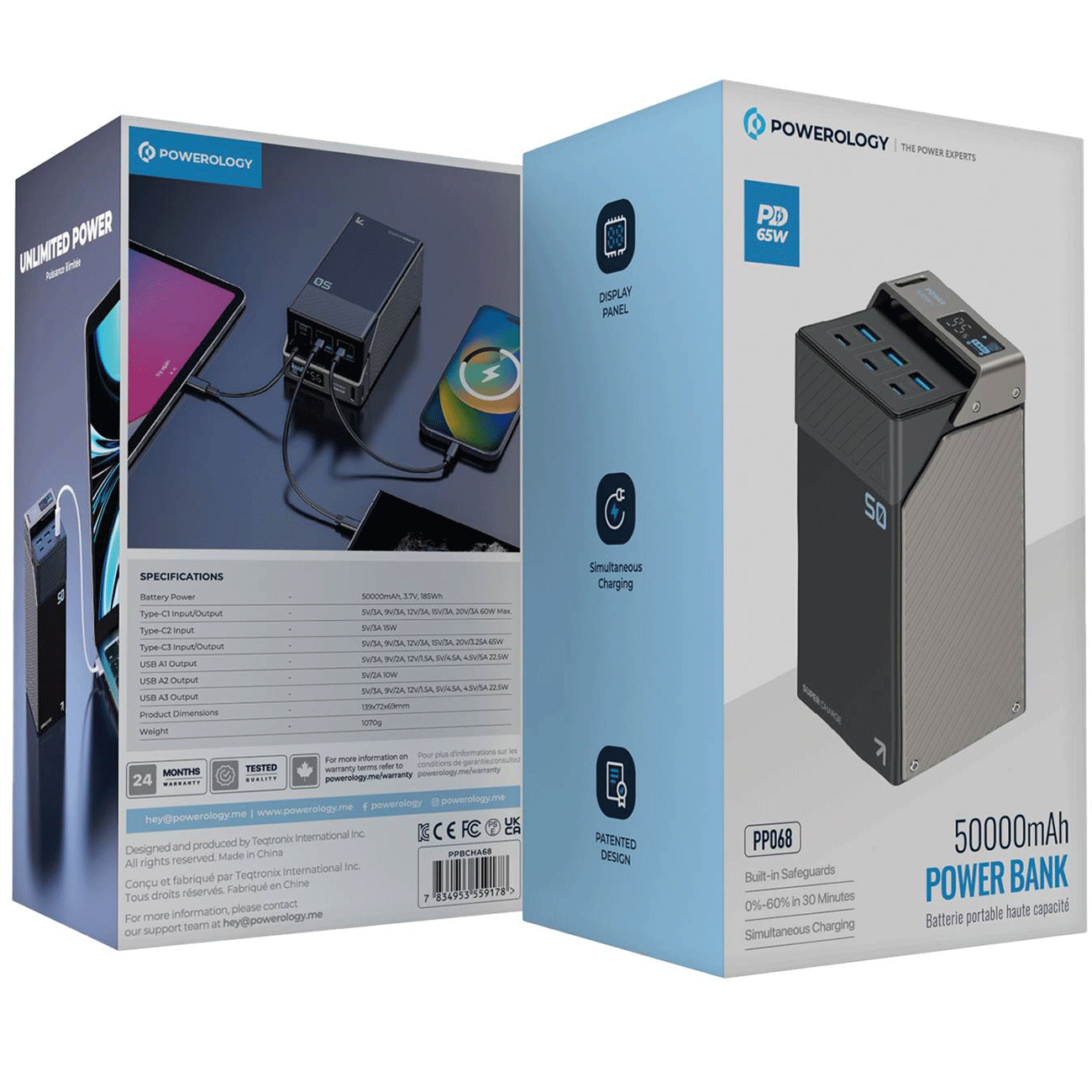 Powerology 50000mAh Power Bank 65W 3×PD Type-C and 3×USB-A