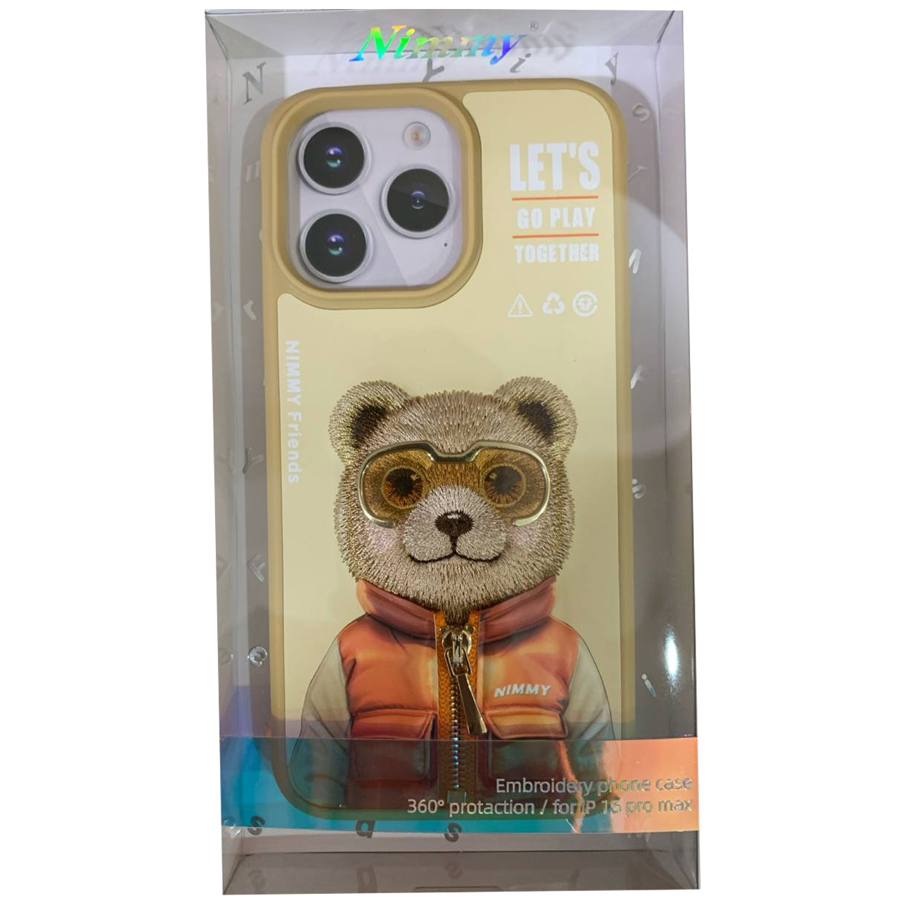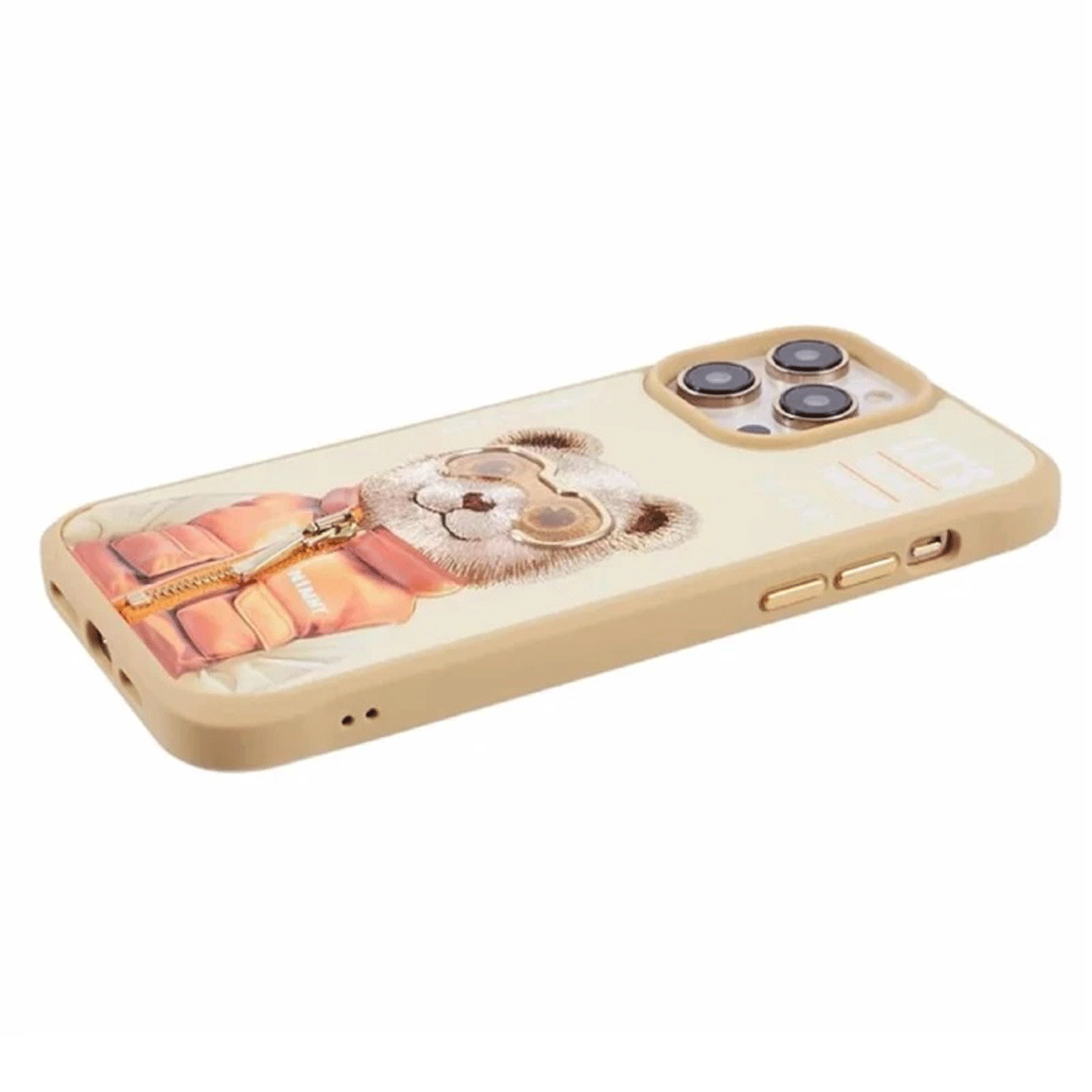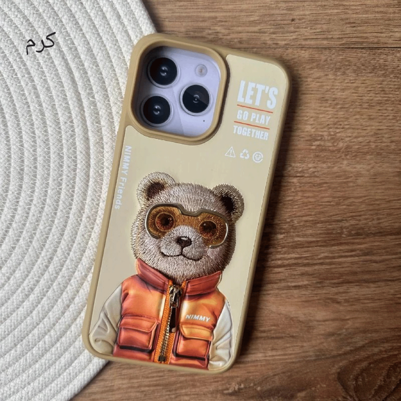 قاب محافظ گوشی آیفون 15 پرومکس طرح خرس با عینک و زیپ واقعی نیمی