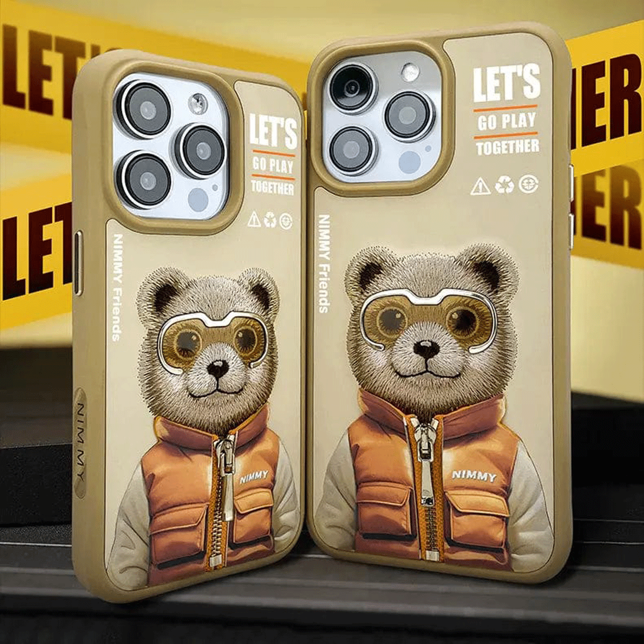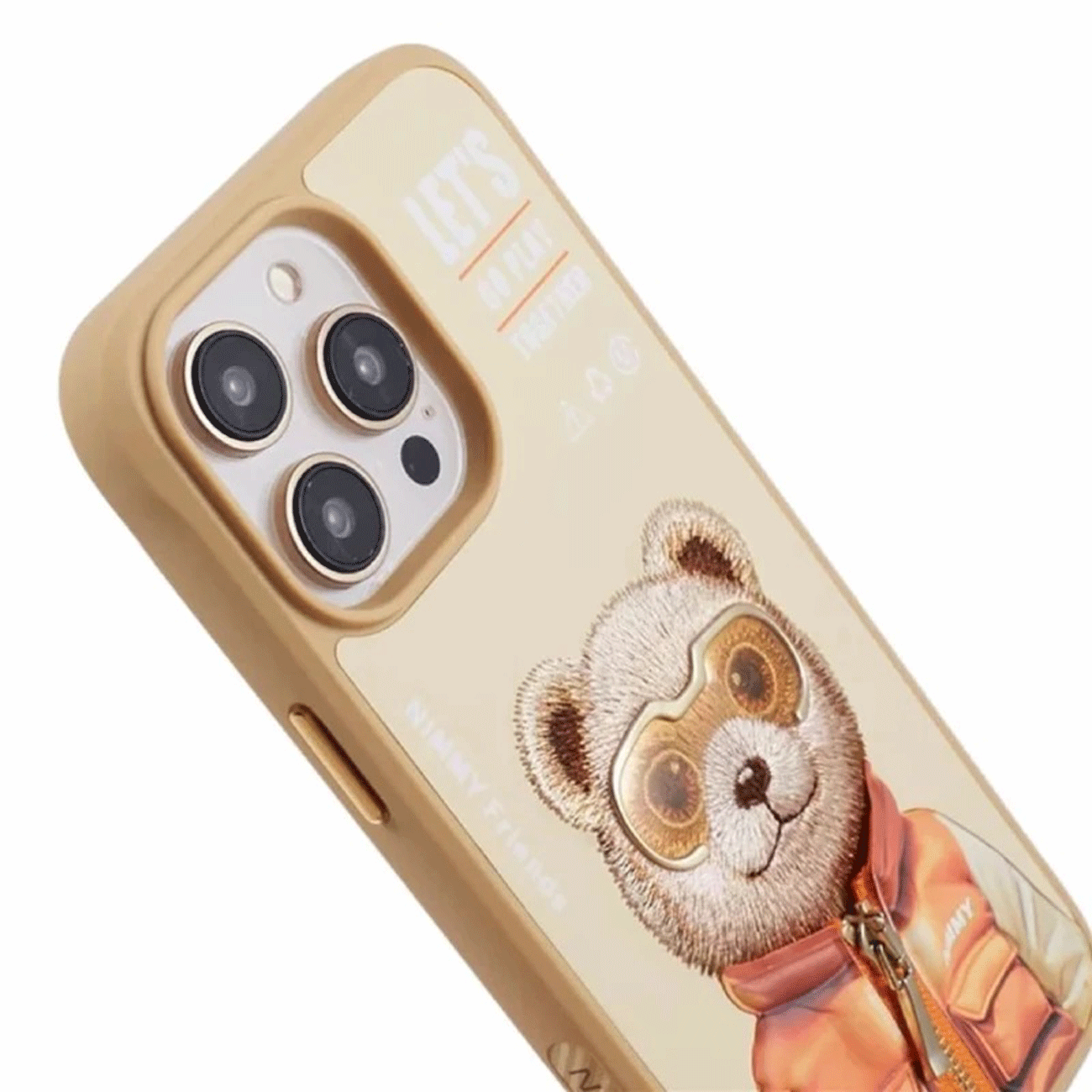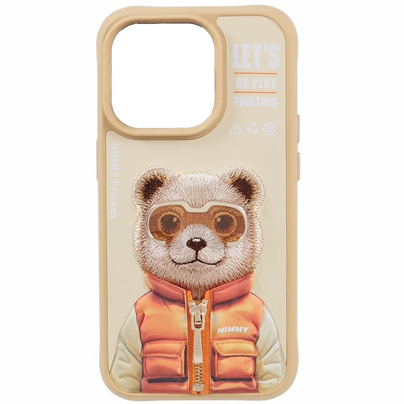 قاب محافظ گوشی آیفون 15 پرومکس طرح خرس با عینک و زیپ واقعی نیمی