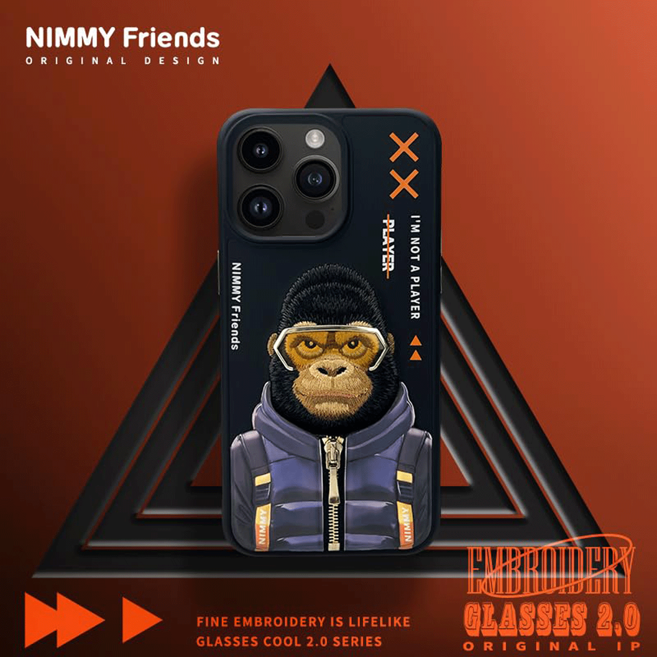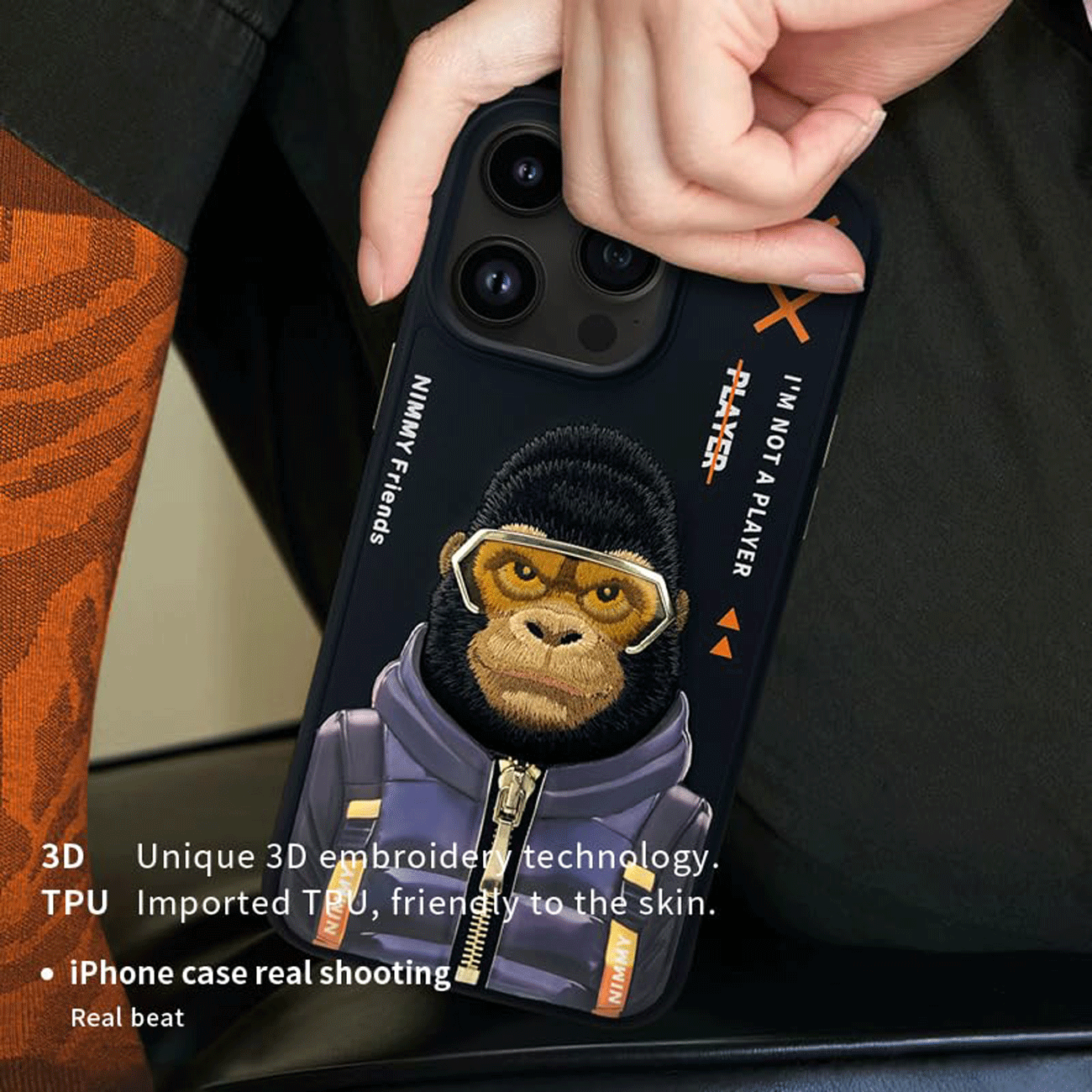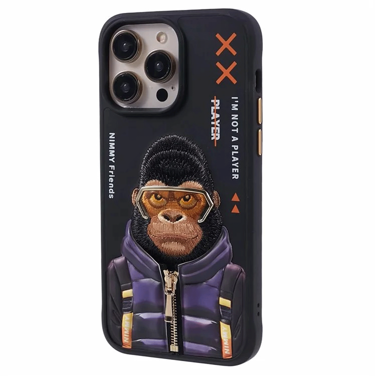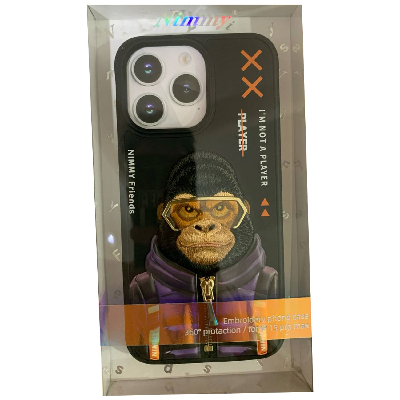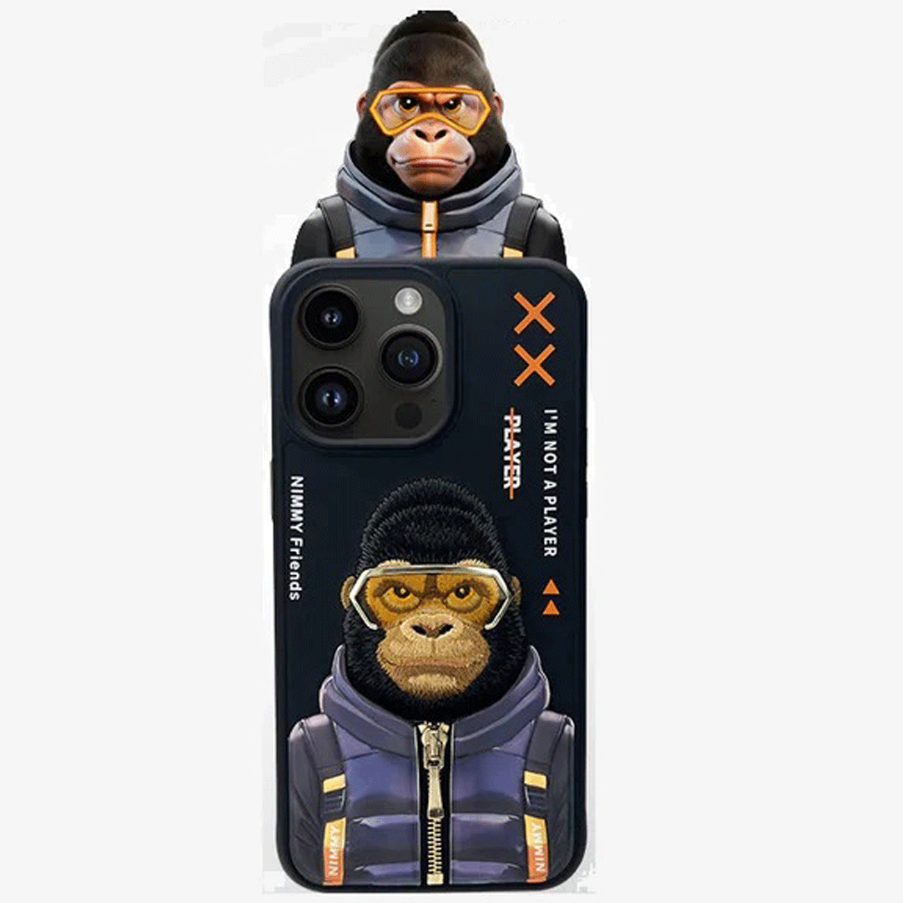قاب محافظ گوشی آیفون 15 پرومکس طرح گوریل با عینک و زیپ واقعی نیمی