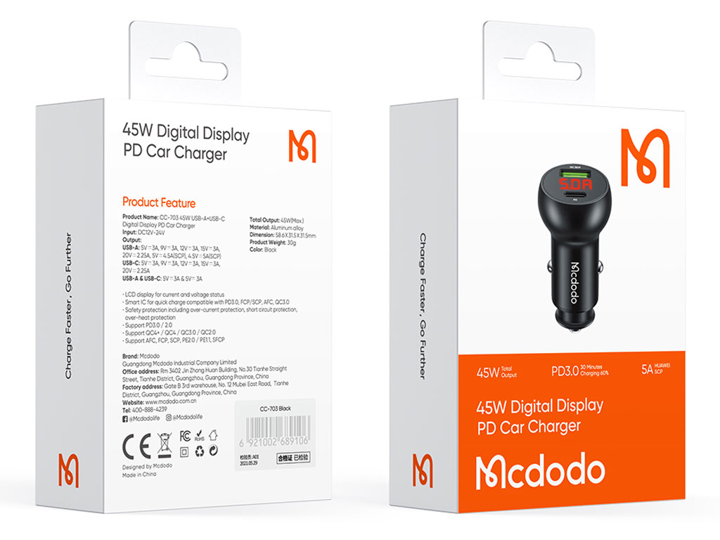 شارژر فندکی خودرو فستشارژ ماشین تایپ سی 45 وات مک دودو CC-7030