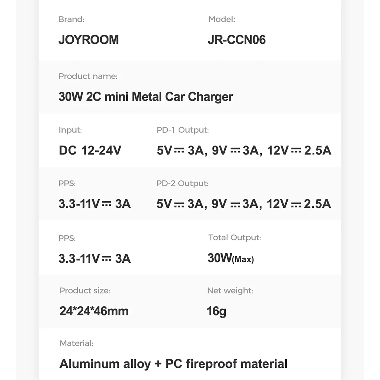 Joyroom JR-CCN06 30W 2x USB-C mini car charger metal