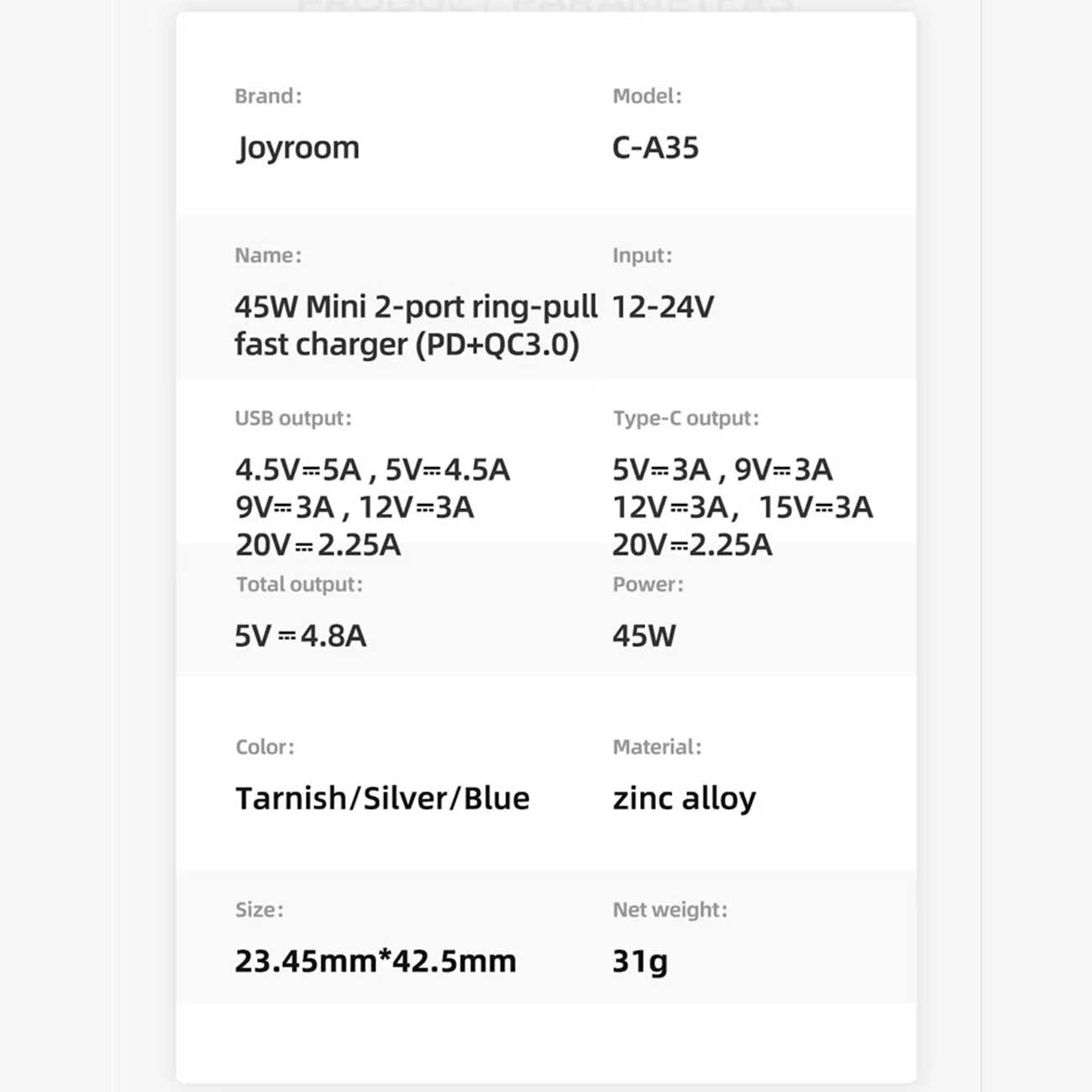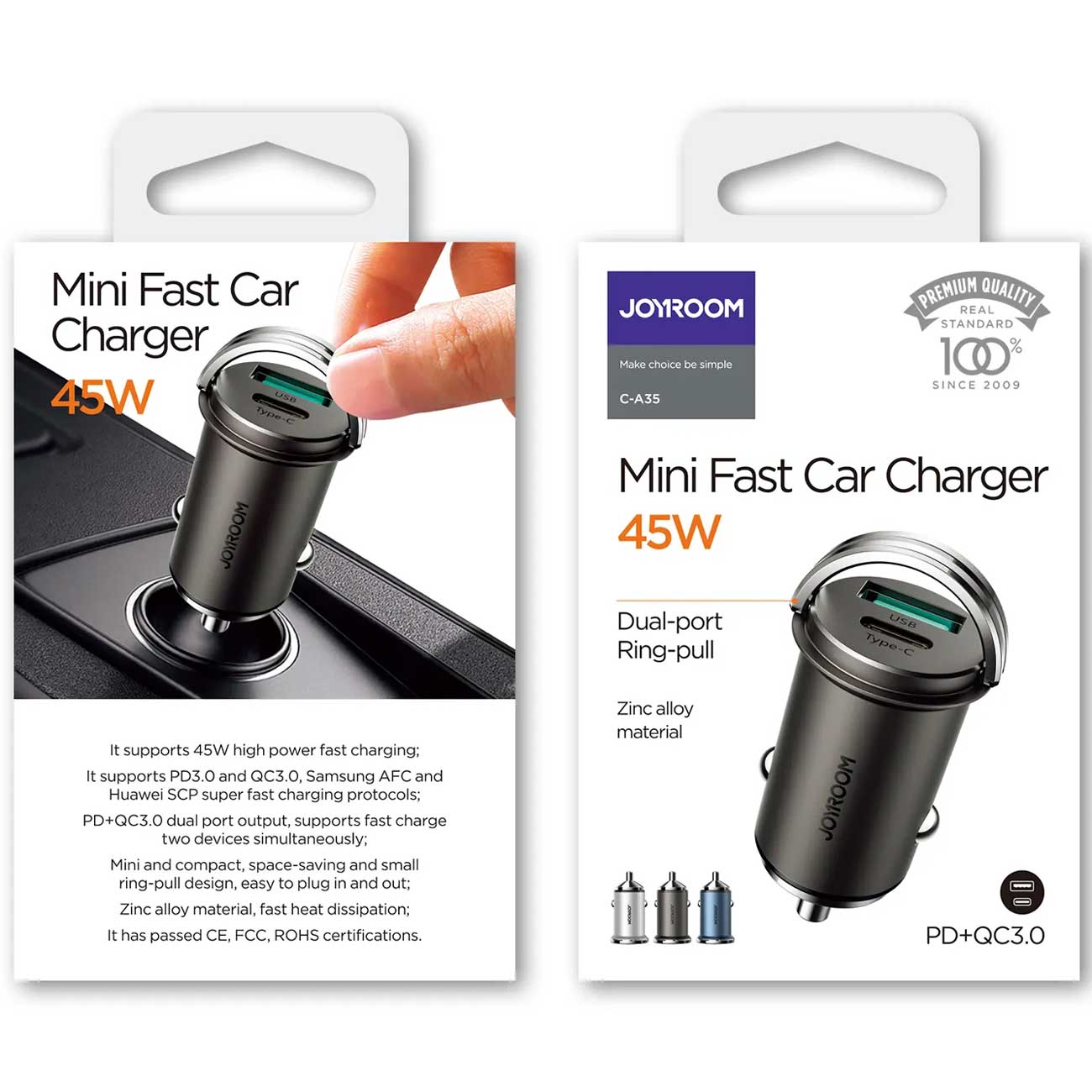 JOYROOM C-A35 45W Mini Metal Pull Ring Car Charger