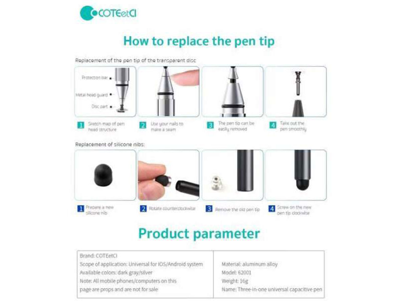 Coteetci three-in-one universal capacitive pen 62001-GY 62001-TS