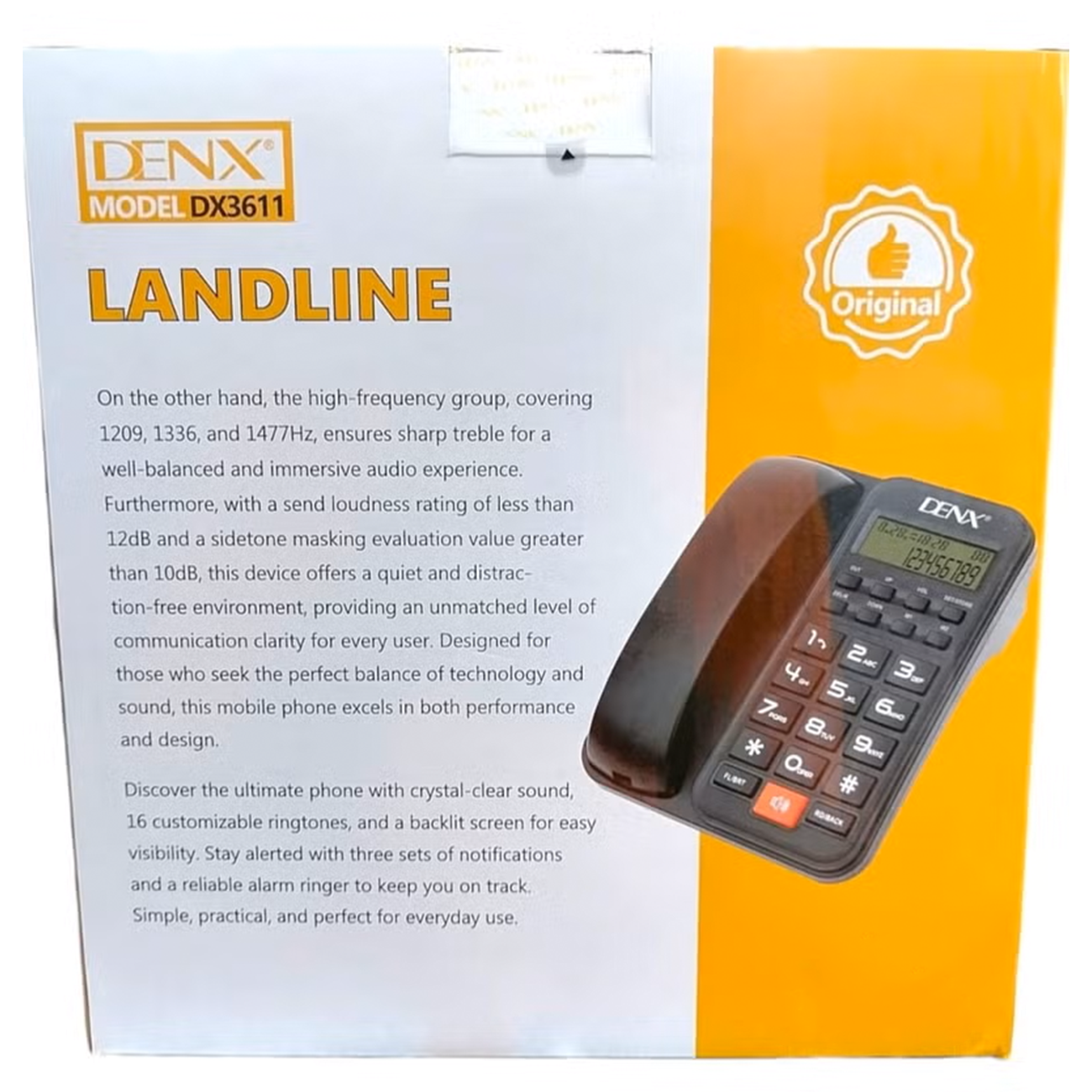 | محتویات جعبه | تلفن دنکس DX3611، دفترچه راهنما، کابل تلفن، گوشی سیمی |
