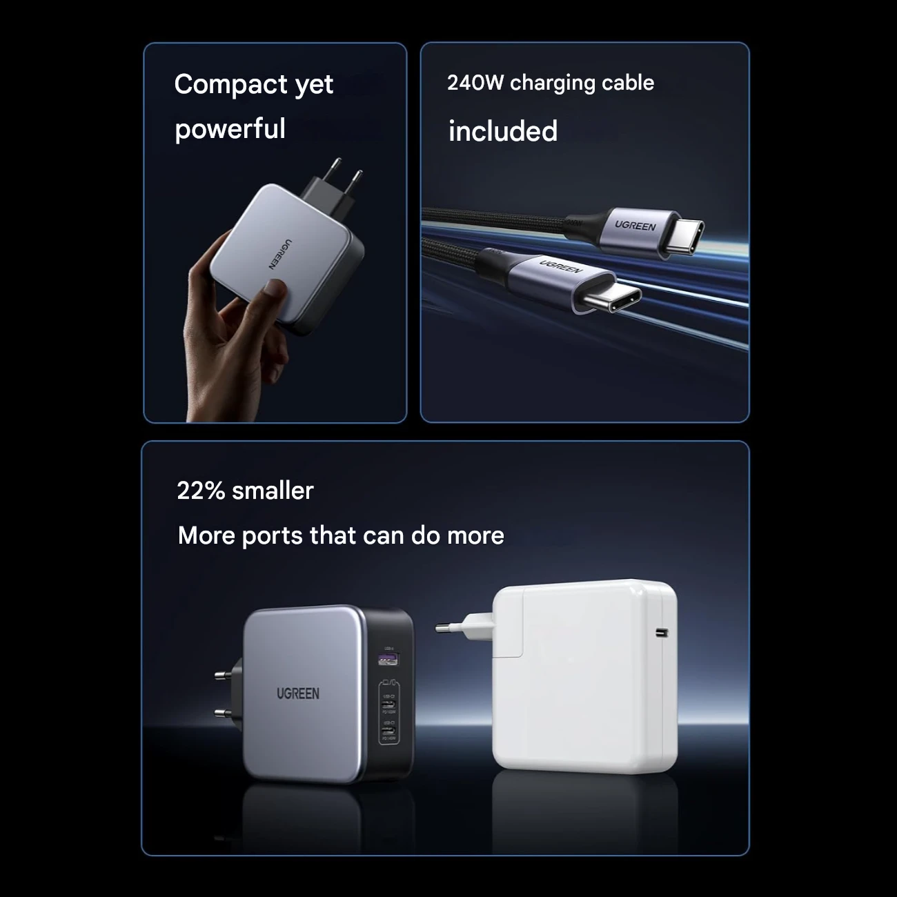 | سایر ویژگیها | - مجهز به فناوری GaN - شارژ سریع 140 وات لپتاپ - شارژ مکبوک پرو 16 اینچی به 56% در 30 دقیقه، آیفون 13 به 60% در 30 دقیقه |