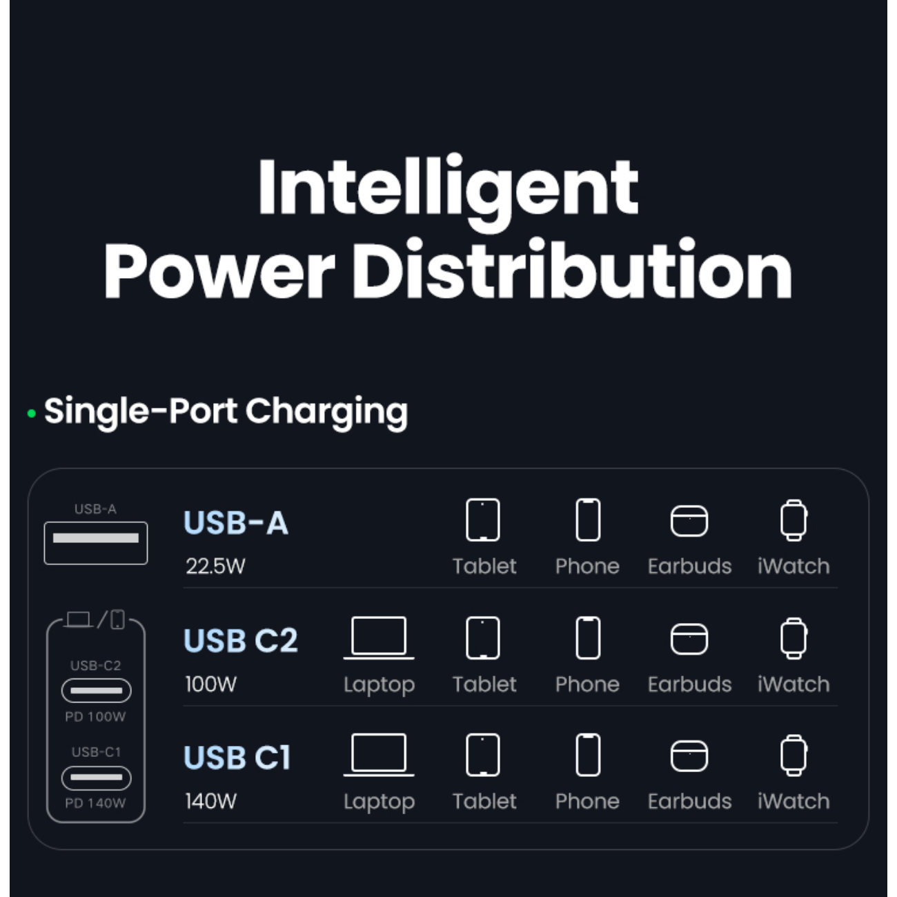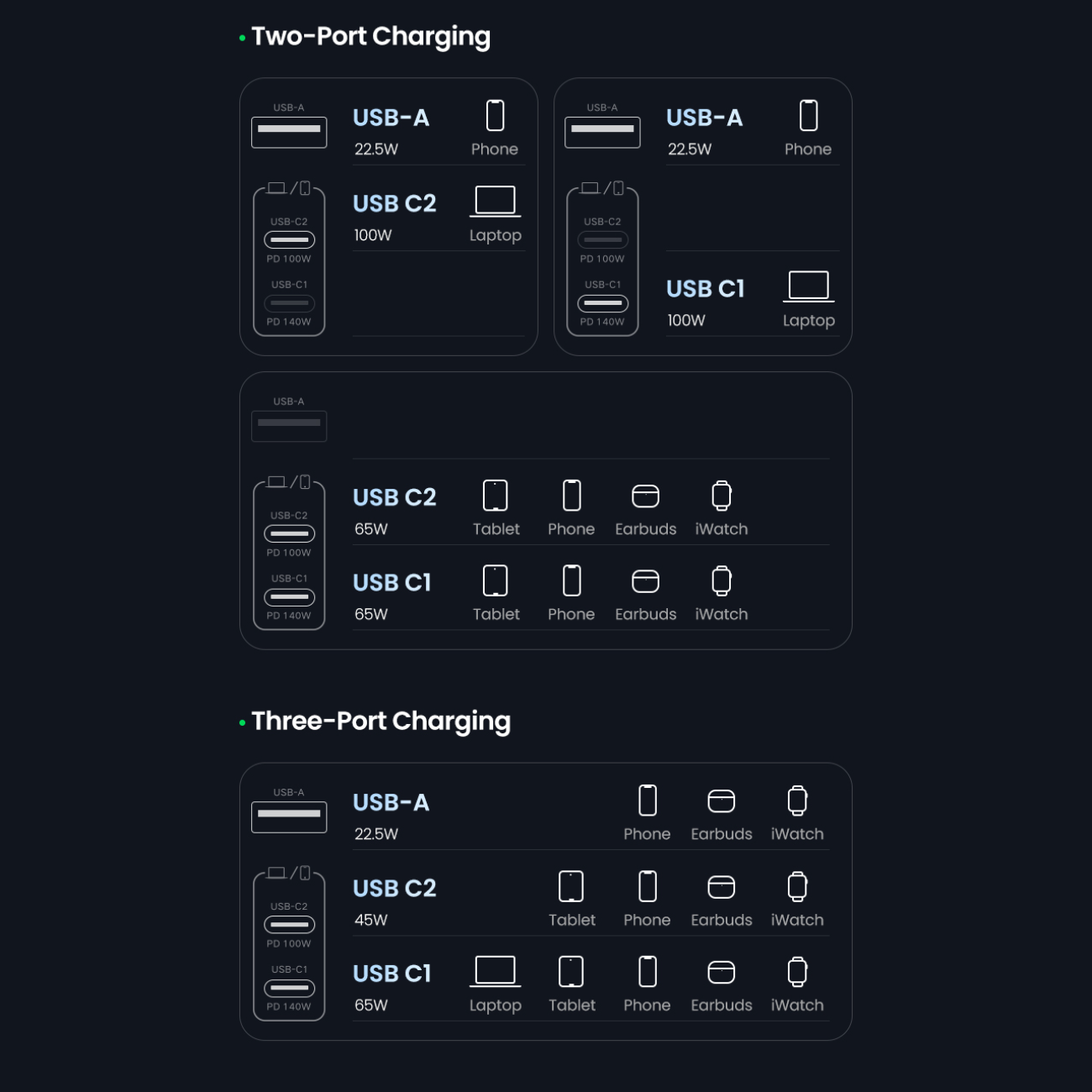 | ولتاژ خروجی | USB-C1: 5V=3A 9V=3A 12V=3A 15V=3A 20V=5A 28V=5A 3.3-11V=3A 3.3-21V=5A 140W Max USB-C2: 5V=3A 9V=3A 12V=3A 15V=3A 20V=5A 3.3-11V=3A 3.3-21V=5A 100W Max USB-A: 5V=4.5A 4.5V=5A 5V=3A 9V=2A 12V=1.5A 22.5W Max |