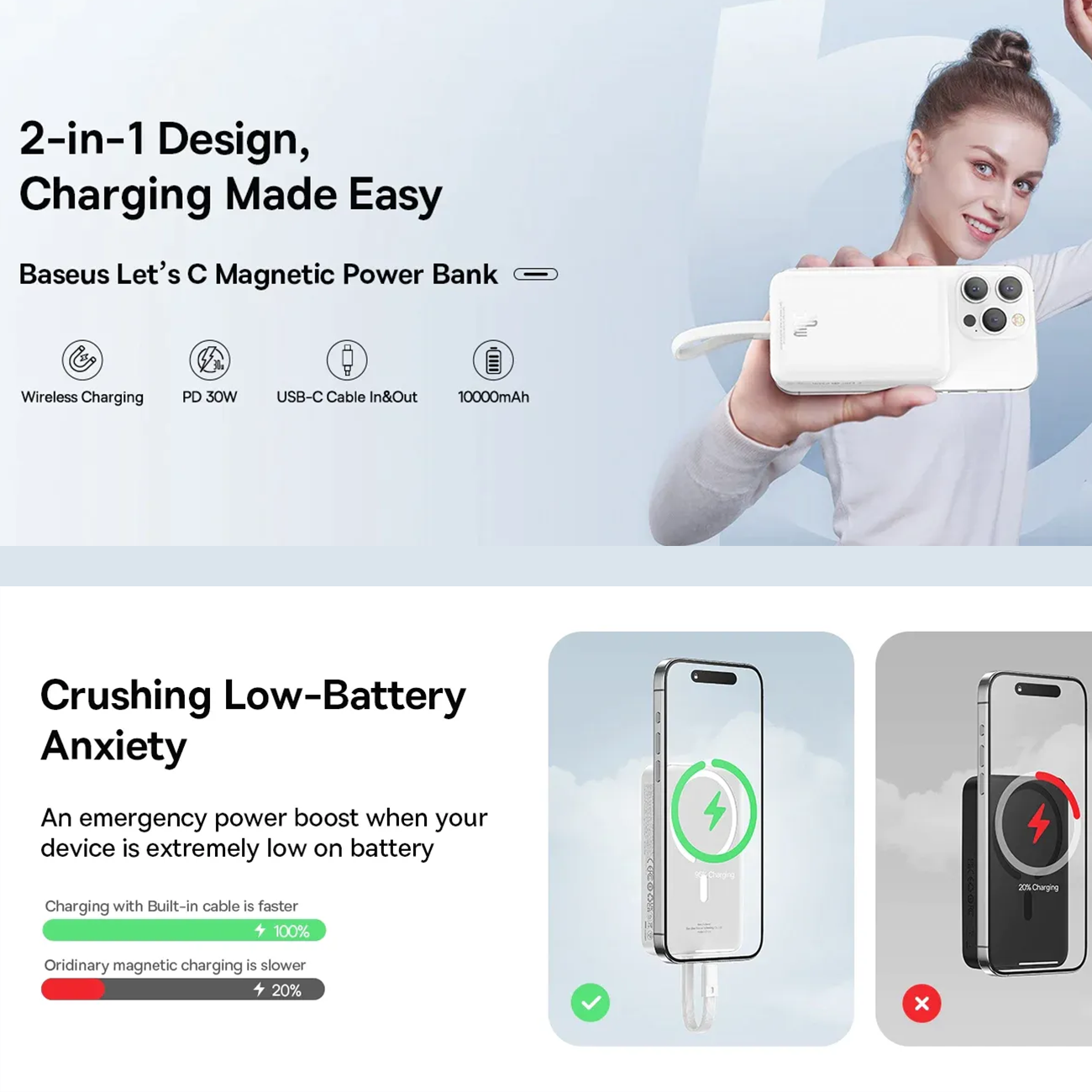 Baseus 10000mAh Magnetic Mini Wireless Fast Charge Power Bank 30W With Built-In Type-C Cable PPCXM10T P1002210B113-00
