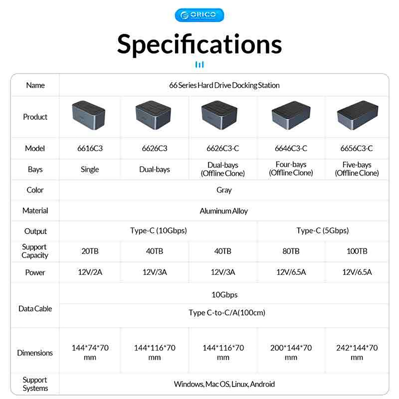 داک هارد و SATA HDD/SSD اوریکو 100 ترابایت ORICO 6656C3-C - پنج سینی