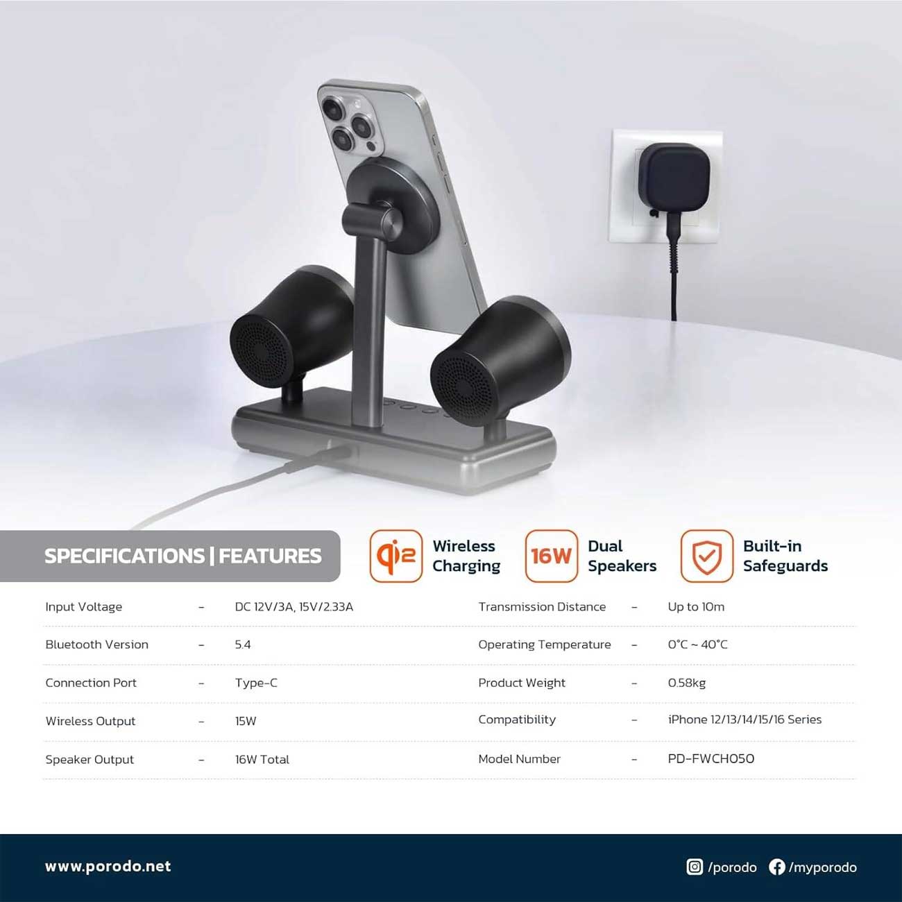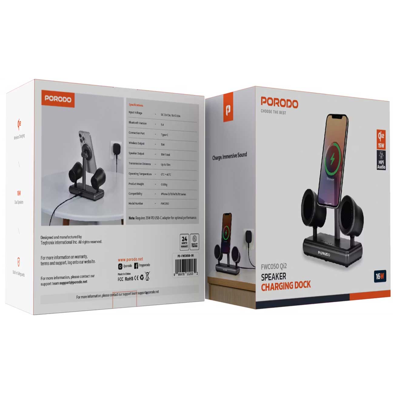 اسپیکر بلوتوثی و شارژر وایرلس پورودو Porodo PD-FWCH050-BK