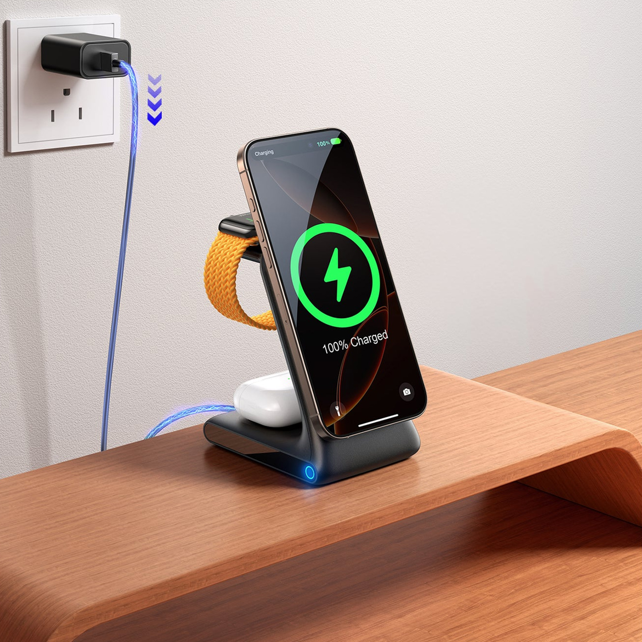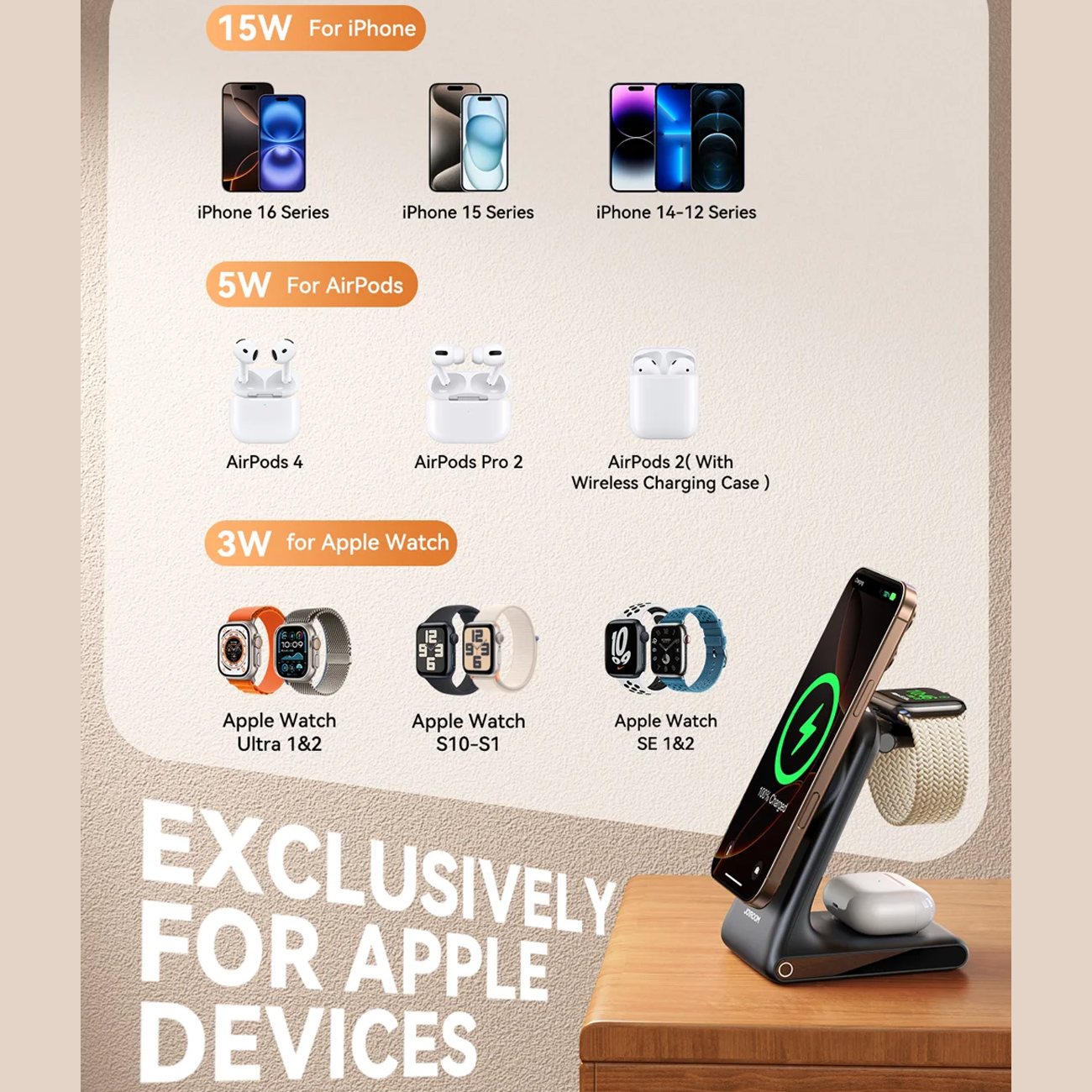 | سایر ویژگیها | شارژ همزمان سه دستگاه، طراحی عمودی ۳ در ۱، پایه مغناطیسی، شارژ سریع، حالت ساعت کنار تخت و پایه تماس ویدیویی، حفاظت هوشمند (کنترل دما، ولتاژ بیشازحد، اتصال کوتاه و جریان بیشازحد) |