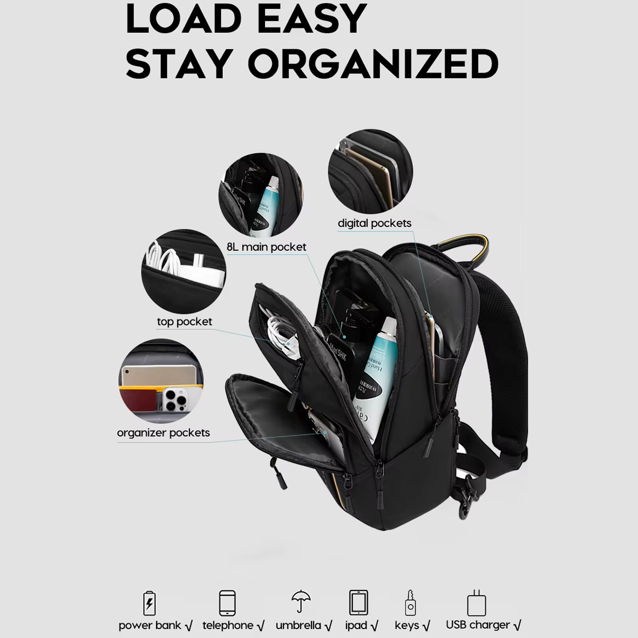 | جیب ها | جیب دیجیتال، جیب جانبی، جیب مخفی، جیب برای گوشی، پاوربانک، شارژر USB و کلید |