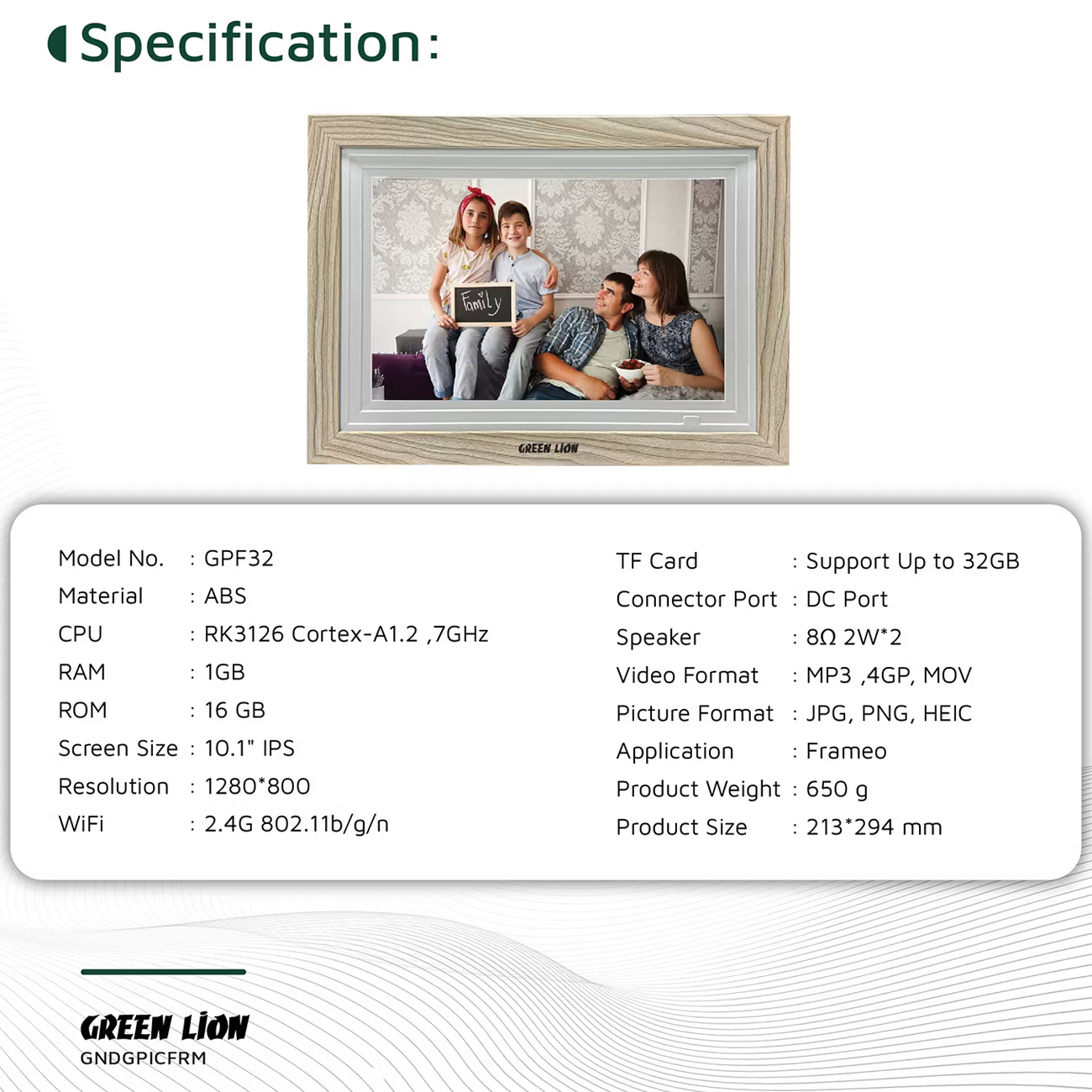 قاب عکس دیجیتال گرین لاین (Green Lion) لمسی 1.01 اینچ مدل GNDGPFRMBK GPF32