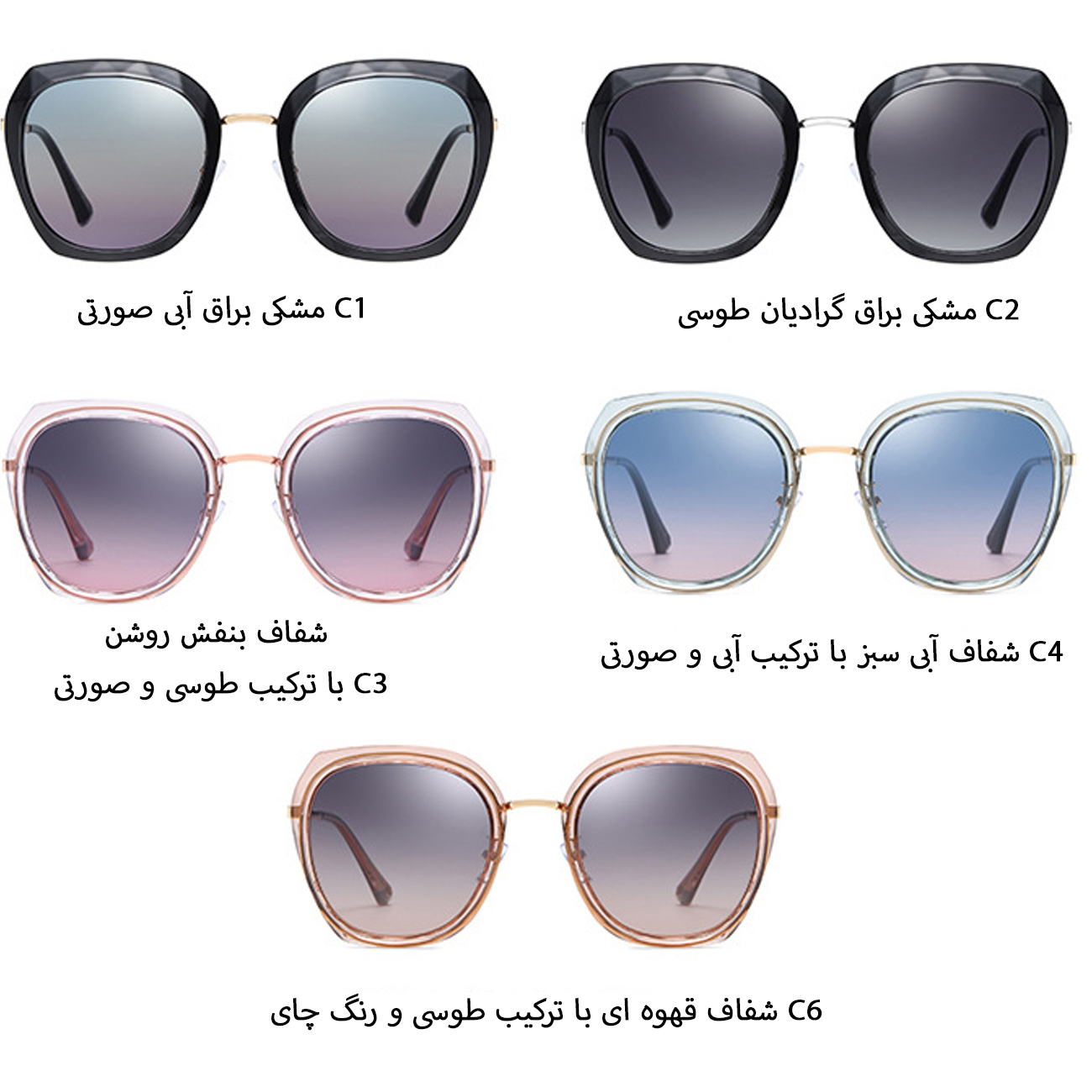 | رنگ بندی | مشکی براق آبی صورتی C1، مشکی براق گرادیان طوسی C2، شفاف بنفش روشن طوسی صورتی C3، شفاف آبی سبز آبی صورتی C4، شفاف قهوهای طوسی چای C6 |