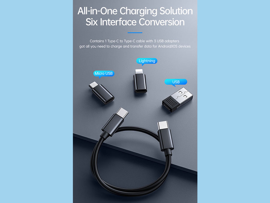 | محتویات داخل پک | کابل شارژ دو سر تایپ سی +تبدیل لایتنینگ + تبدیل میکرو + تبدیل یو اس بی |