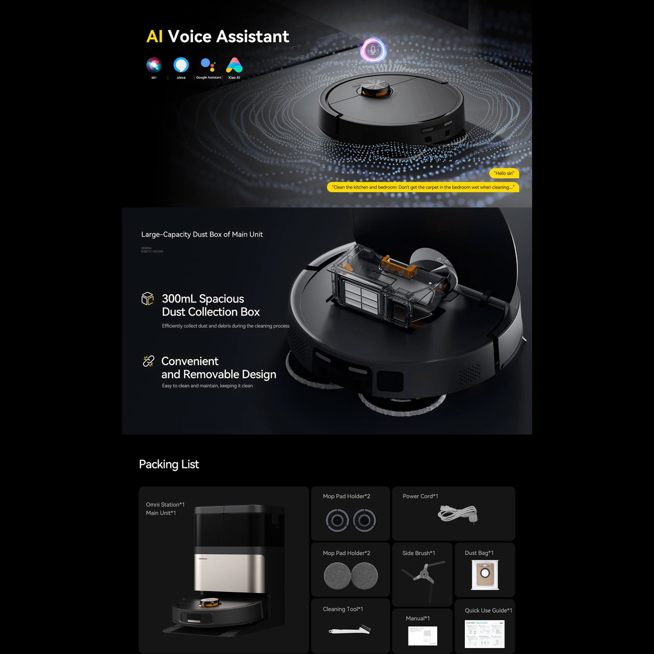 | عملکرد ایستگاه Omni Station | تخلیه زباله، شستشوی پد، خشککن، شارژ آب ربات، شارژ باتری |
