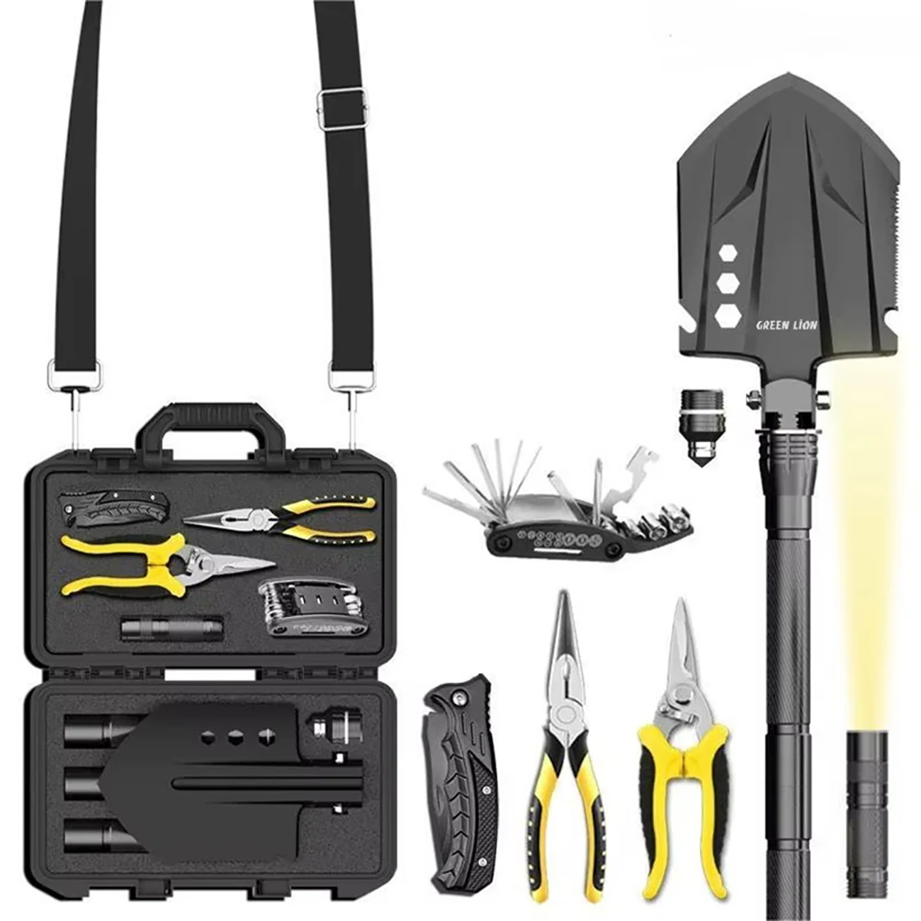| ابزارها شامل | بیل تاشو، انبردست، سیمچین، چاقوی چندکاره، چراغ قوه LED، ابزار تعمیراتی، سری ضربهزن، 2 میله افزایش طول، کیف حمل و بند شانهای |