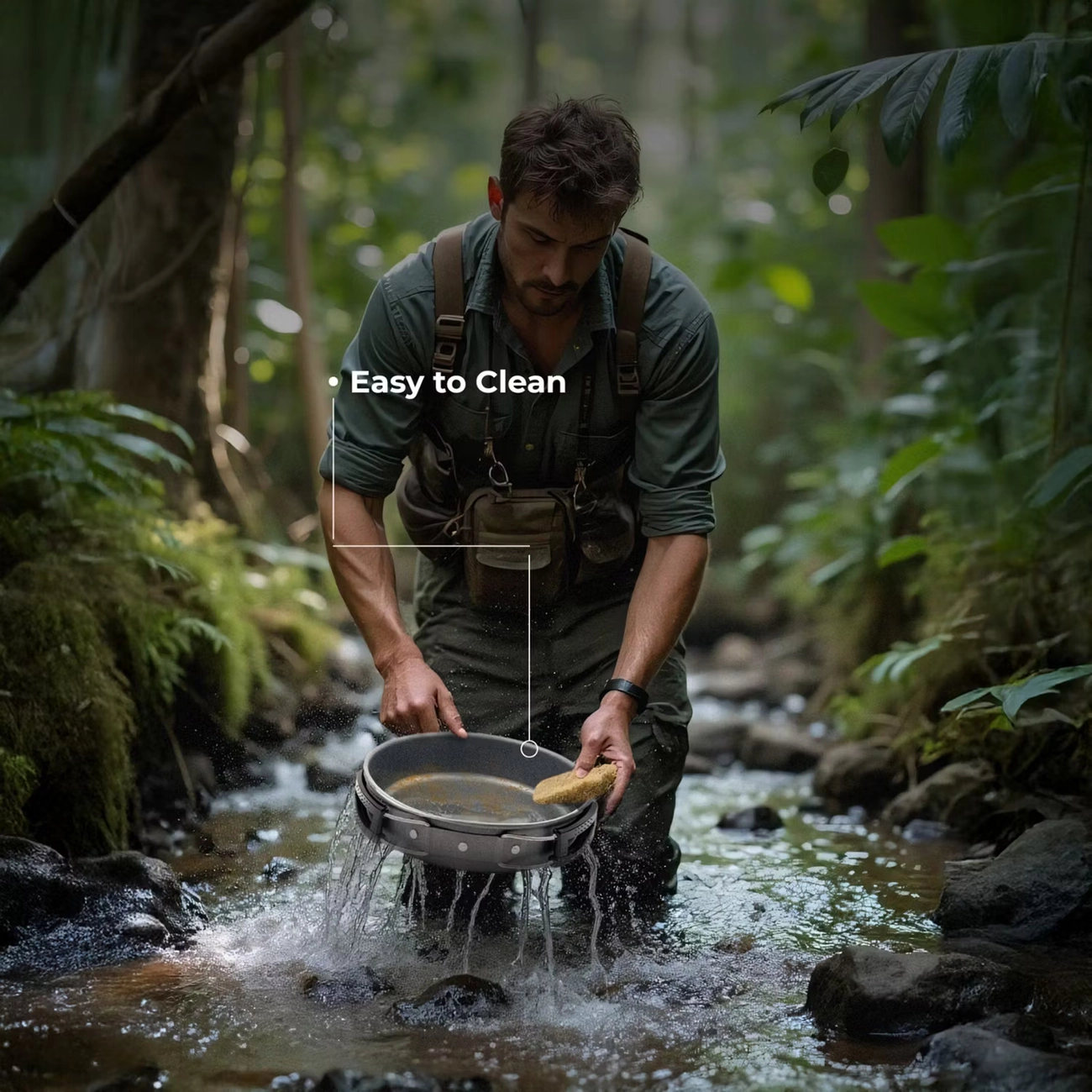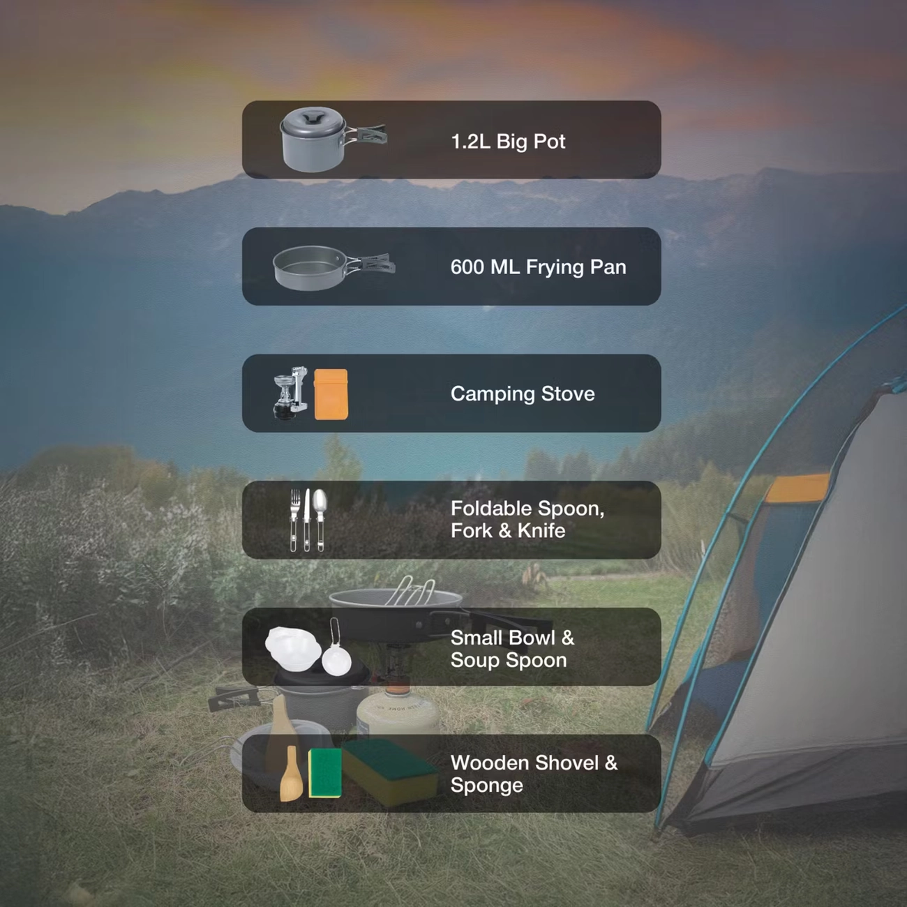 | اقلام موجود در جعبه | قابلمه بزرگ، ماهیتابه، اجاق گاز کمپینگ (Camping Stove)، قاشق تاشو، چنگال تاشو، چاقو تاشو، ملاقه سوپ تاشو، کاسه کوچک، کفگیر چوبی، اسفنج شستشو |