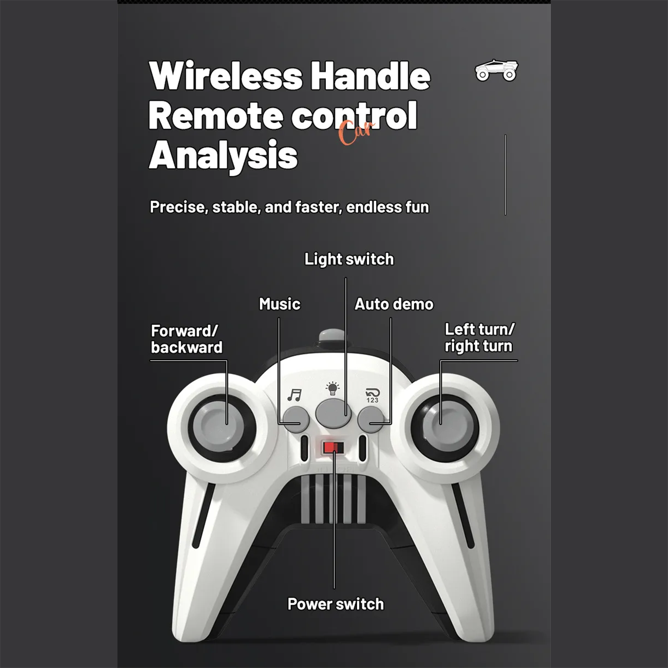 | ریموت کنترل چندحالته | حرکت به جلو/عقب، چپ/راست، حالت نمایشی (Auto Demo)، تغییر موزیک، چراغها |