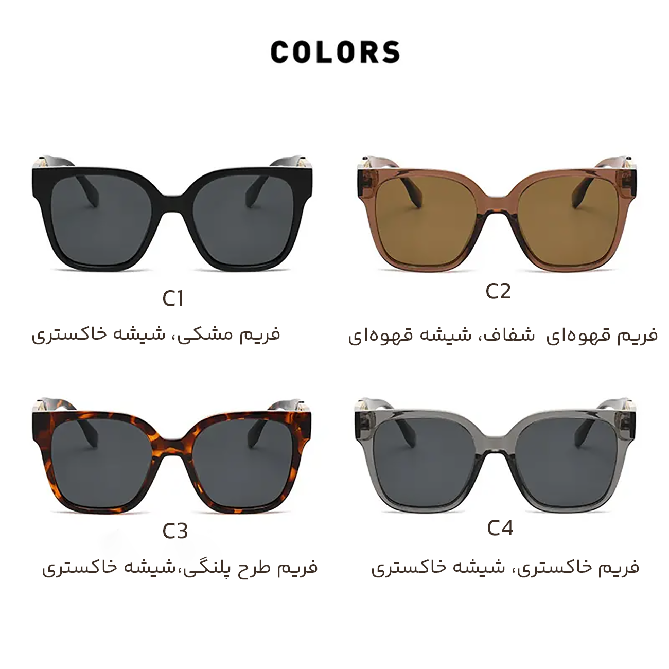 | رنگ بندی متنوع و جذاب | فریم مشکی، شیشه خاکستری c1/ فریم قهوه ای شفاف، شیشه قهوه ای C2/ فریم پلنگی، شیشه خاکستری C3 / فریم خاکستری، شیشه خاکستری C4 |