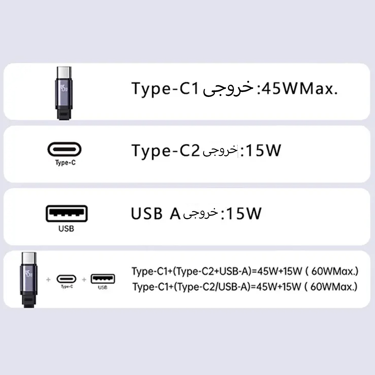 | خروجی Type-C1+(Type-C2/USB-A) | 45W+15W,60W Max |
