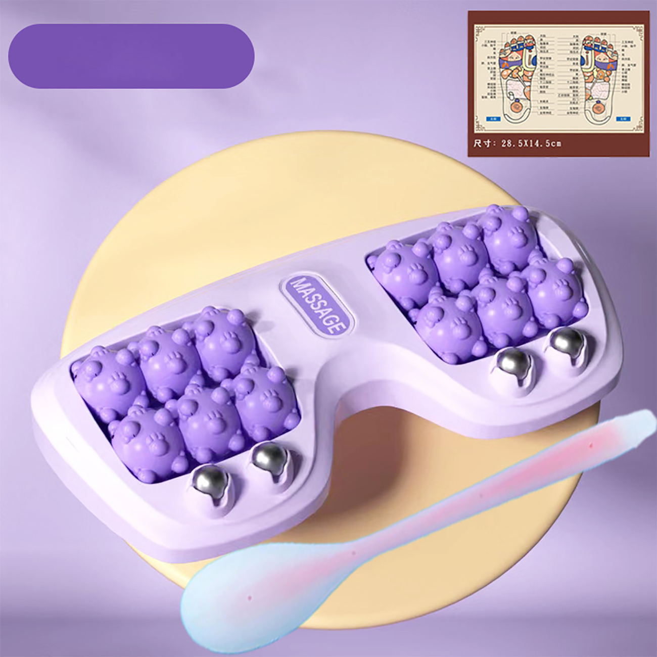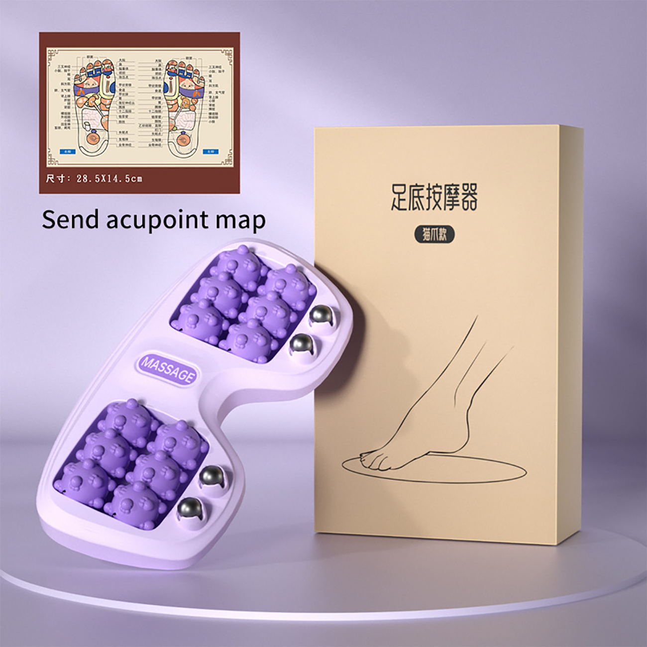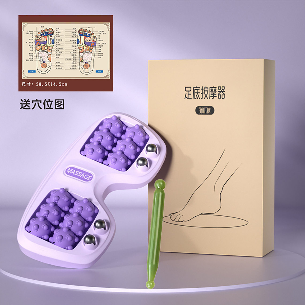 | محتویات جعبه | 1 عدد ماساژور پا/ 1 عدد نقشه نقاط طب سوزنی |
