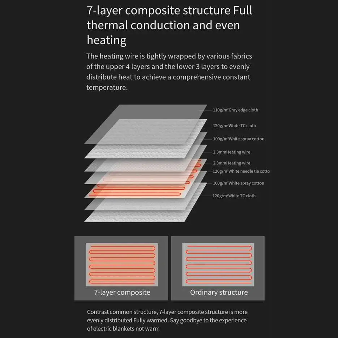 | مواد و لایه ها | ۷ لایه ترکیبی: ۴ لایه بالا، ۳ لایه پایین برای گرمایش یکنواخت، شامل 120g/m² White TC cloth، 110g/m² Gray edge cloth، 100g/m² White spray cotton، کابل حرارتی 2.3mm، لایههای محافظ و نخهای حرارتی |