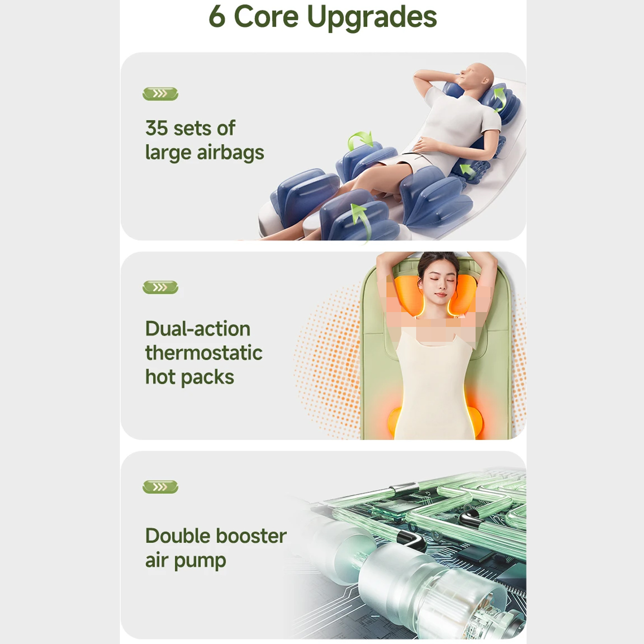 | طراحی عملکردی | ماساژ هوا فشاری، حرارت، پوشش کامل بدن |
