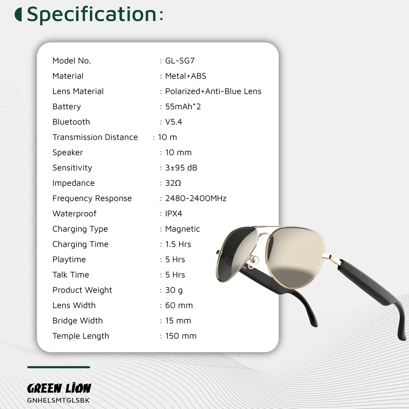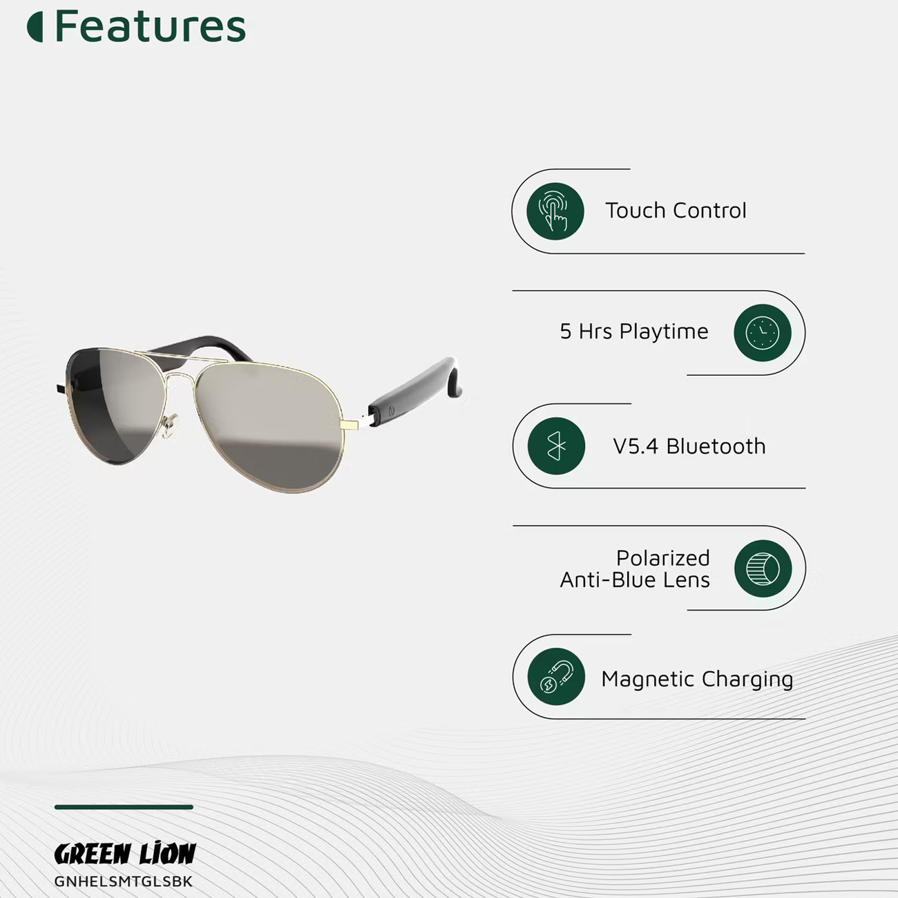عینک آفتابی هوشمند گرین لاین Green Lion مدل GL-SG7 پوشش UV400
