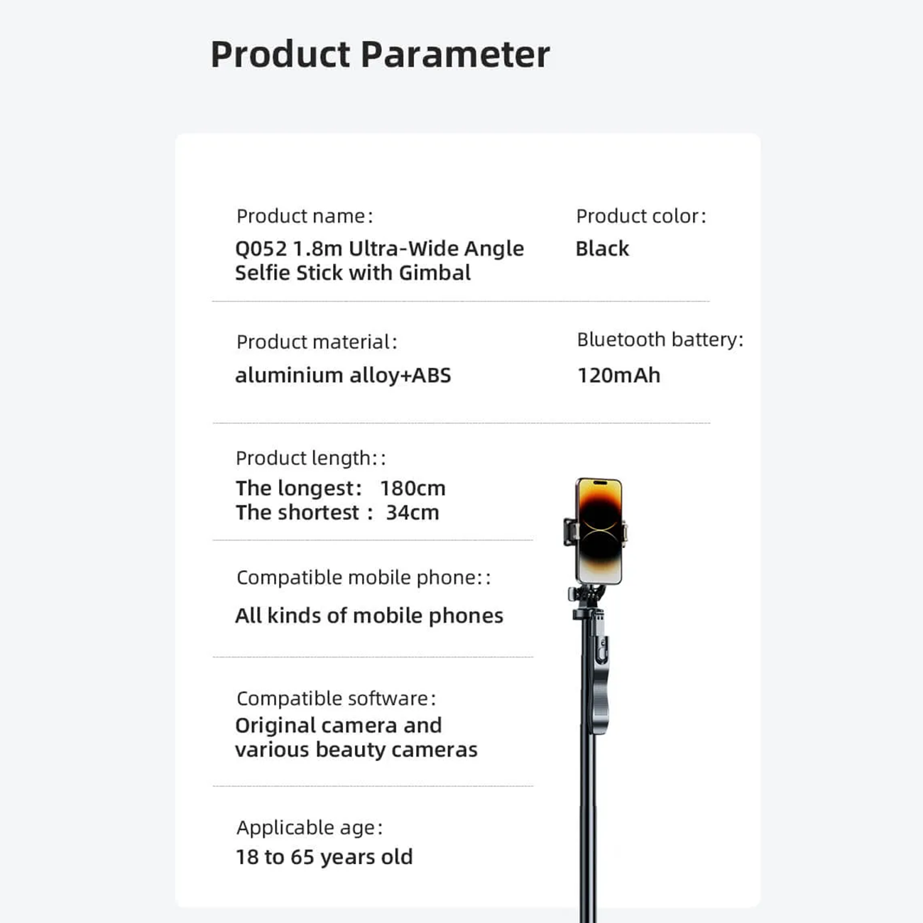 Rtako Q052 1.8M Ultra Wide Angle Selfie Stick With Bluetooth Remote