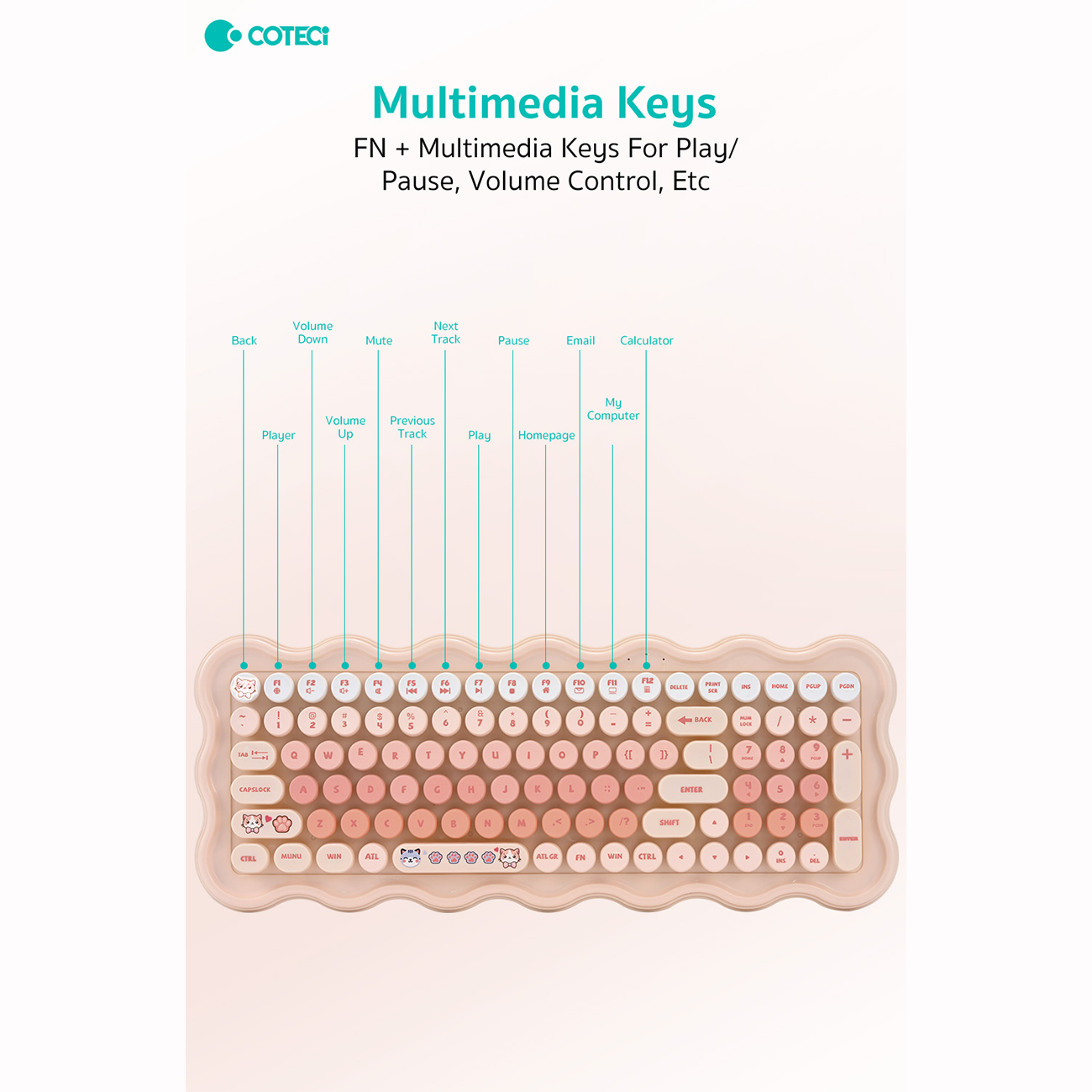 | ویژگیهای شاخص کلیدهای کیبورد | گوشه های گرد کلیدها، بدون صدا و راحت/ طراحی گربه و پنجه گربه/ طرح های رنگی ملایم و زیبا |