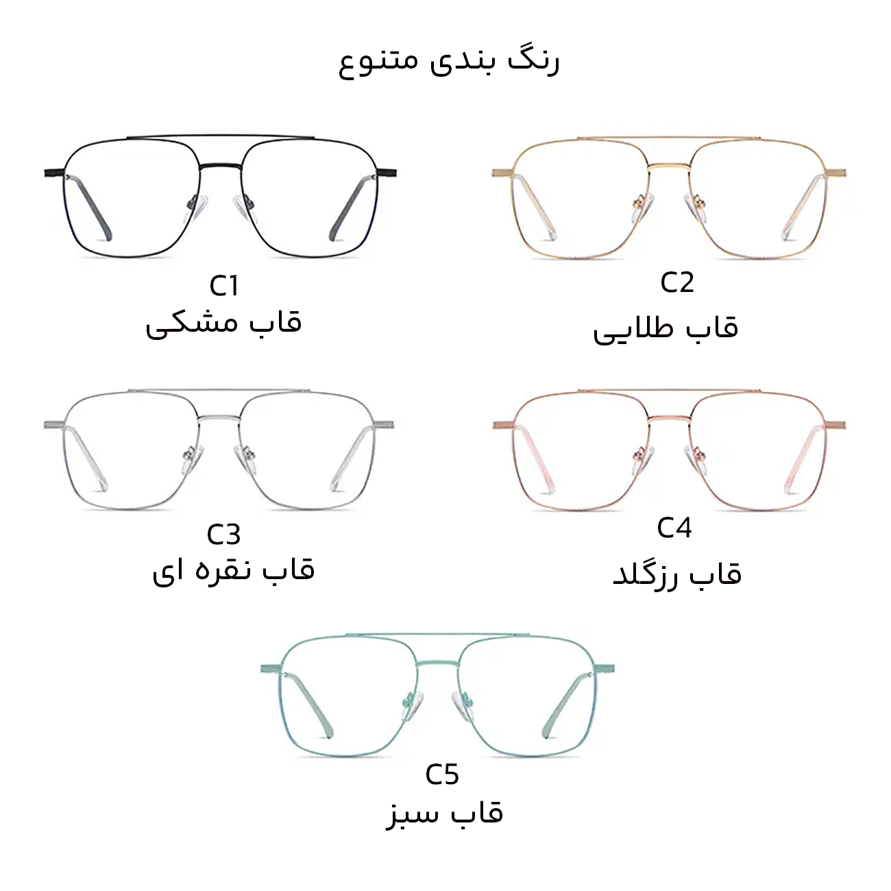| رنگ بندی متنوع قاب | قاب مشکی C1،. قاب طلایی C2،. قاب نقرهای C3،. قاب رزگلد C4،. قاب سبز C5 |