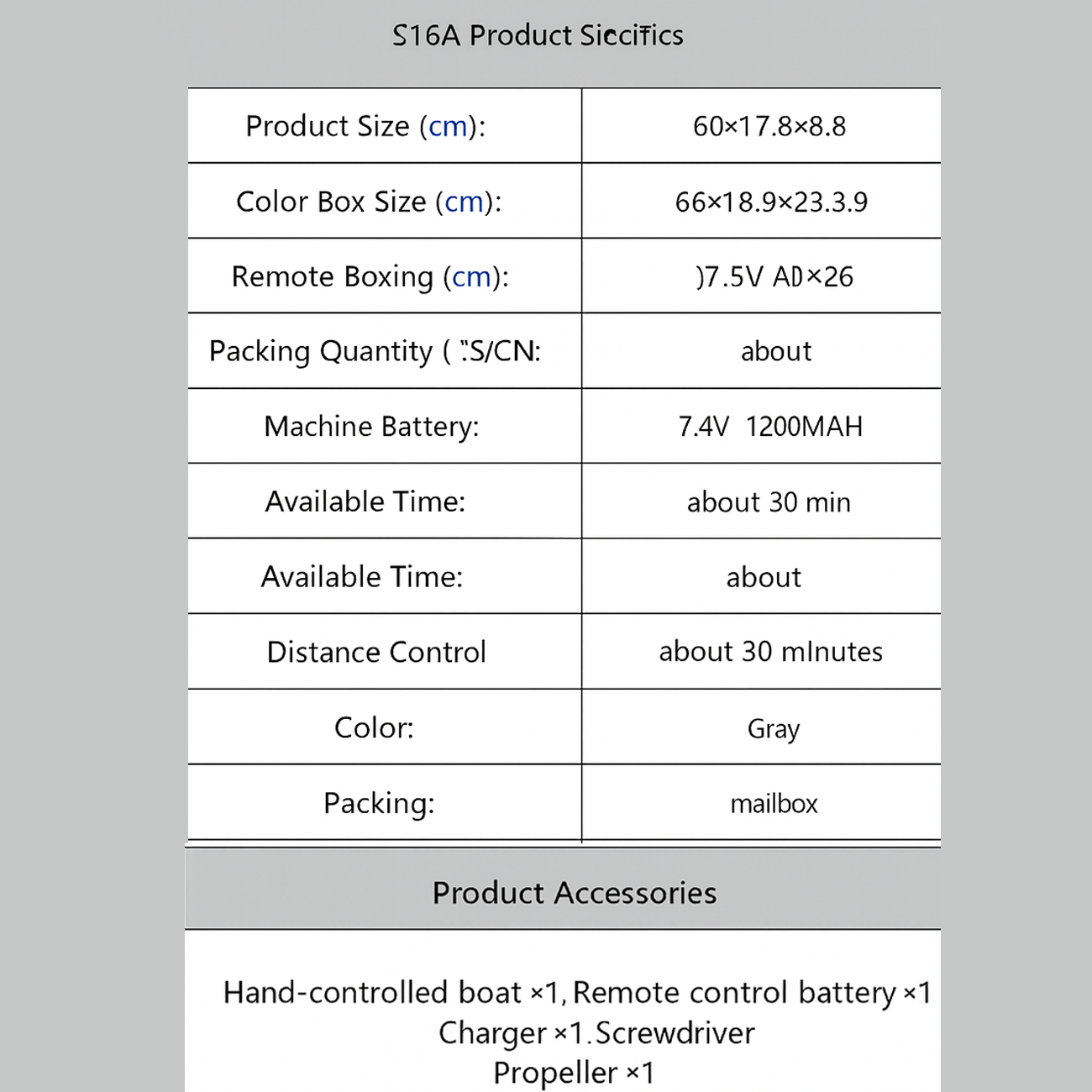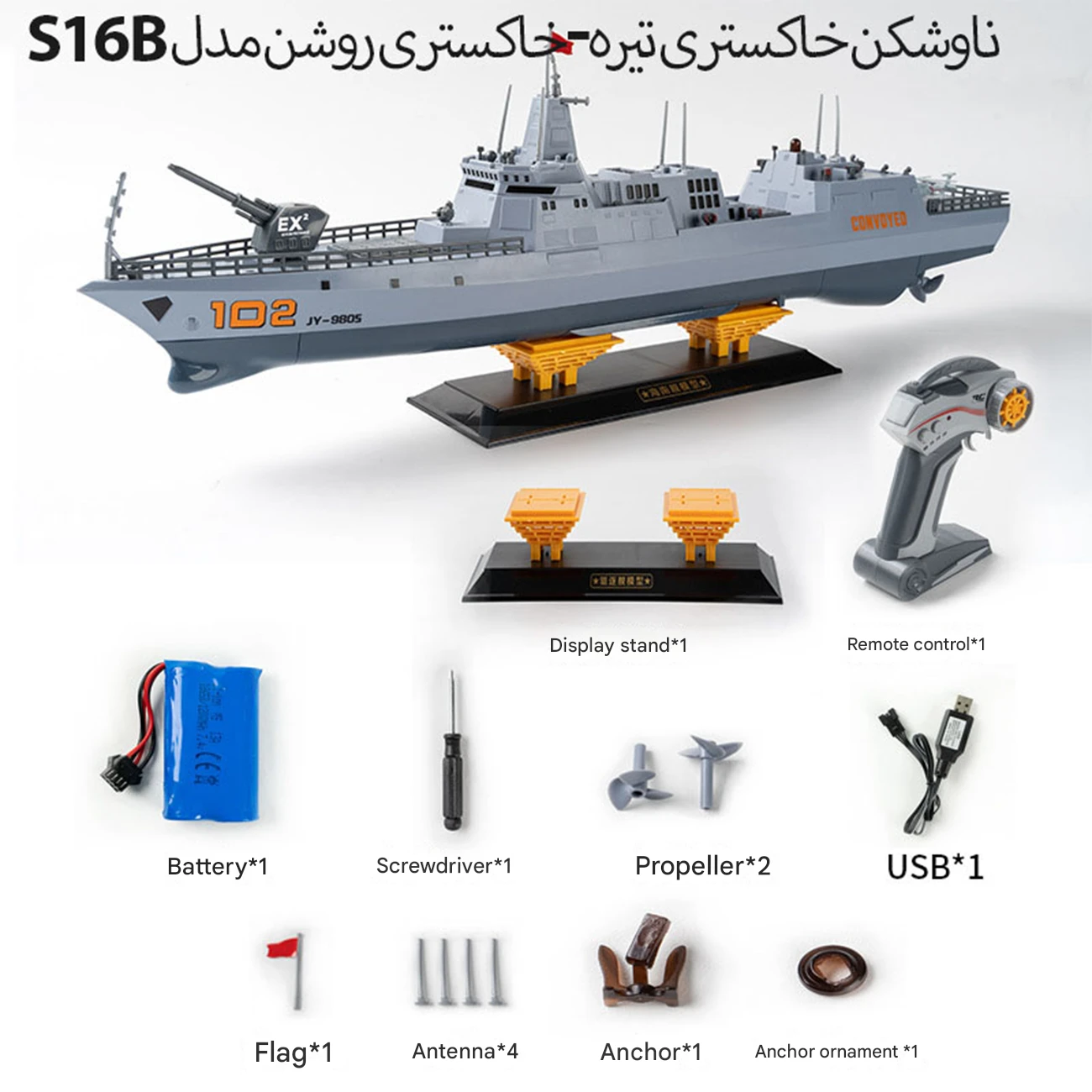 | اقلام درون جعبه S16B | ریموت، باتری، پروانه، استند، پرچم، آنتن |