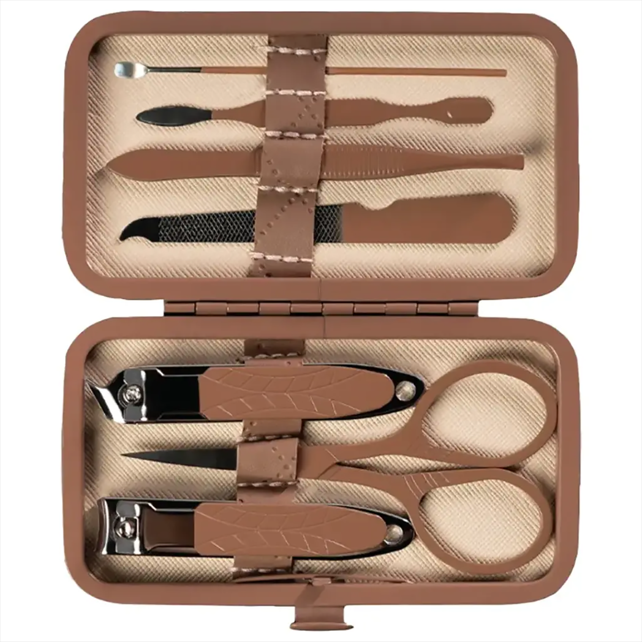 ابزارها | ناخنگیر بزرگ/ ناخنگیر کوچک/ قیچی ابرو و ناخن/ موچین دقیق/ سوهان فلزی/ ابزار تمیزکننده زیر ناخن/ ابزار فشاردهنده کوتیکول |